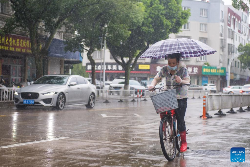 NINGBO, 29 julio, 2025 (Xinhua) -- Una mujer conduce una bicicleta en medio de una fuerte lluvia, en el distrito de Xiangshan de Ningbo, en la provincia de Zhejiang, en el este de China, el 29 de julio de 2025. El tifón Co-May, el octavo tifón de este año, trajo fuertes lluvias al distrito de Xiangshan de Ningbo. Los barcos locales han regresado al puerto para refugiarse y se han suspendido los servicios de ferry. (Xinhua/Jiang Han)