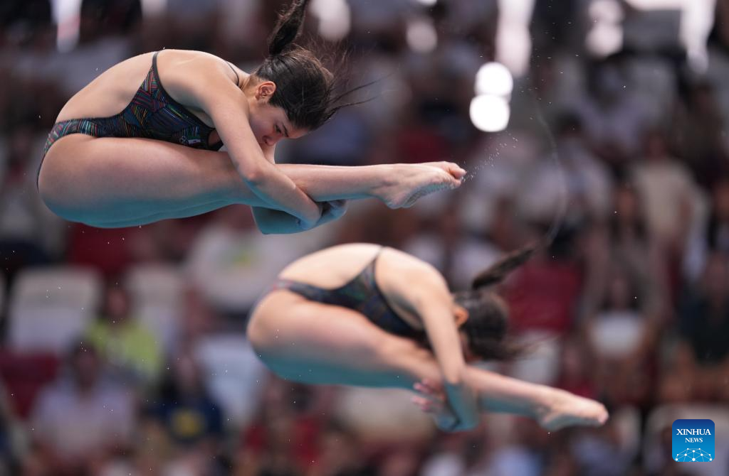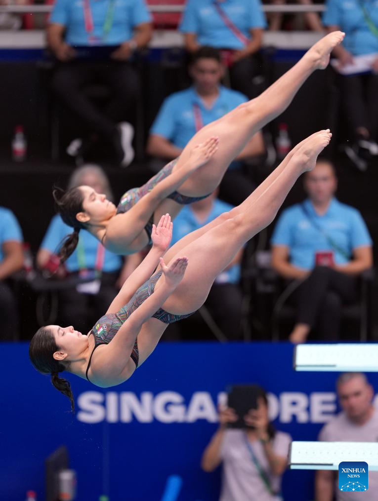 SINGAPUR, 29 julio, 2025 (Xinhua) -- Lía Yatzil Cueva Lobato/Mía Zazil Cueva Lobato, de México, compiten durante la final de trampolín sincronizado femenino de 3m de clavados en el Campeonato Mundial de Deportes Acuáticos, en Singapur, el 29 de julio de 2025. (Xinhua/Wu Zhizun)