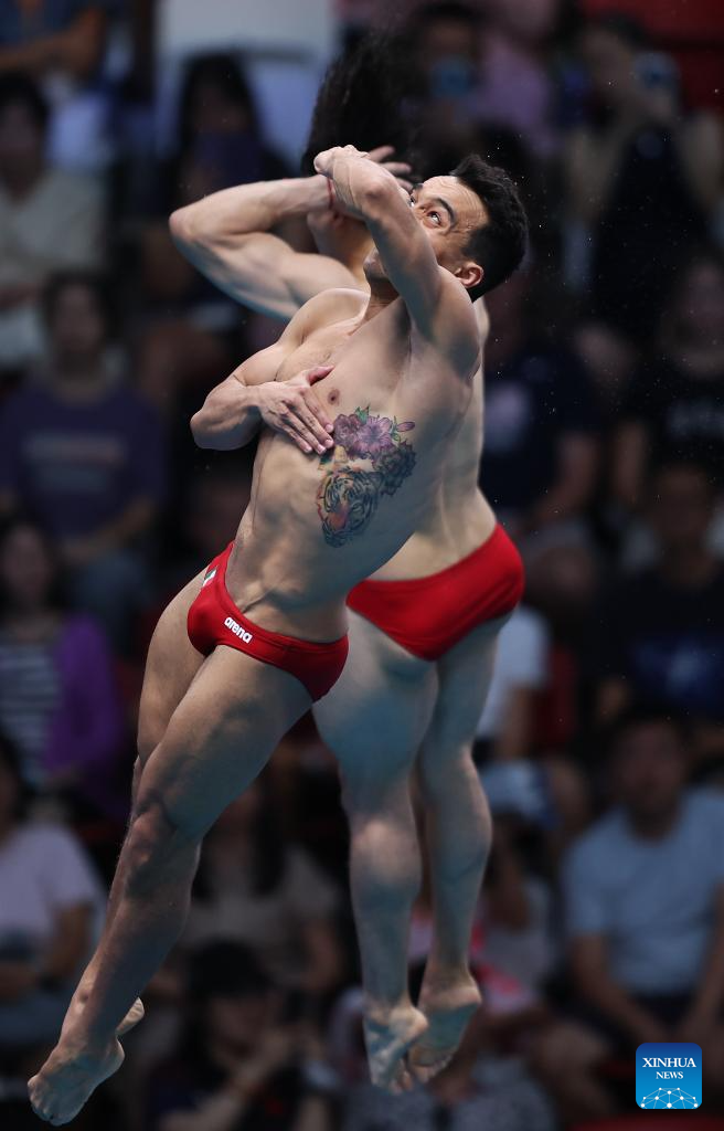 SINGAPUR, 28 julio, 2025 (Xinhua) -- Juan Manuel Celaya Hernández/Osmar Olvera Ibarra, de México, compiten durante la final de 3m sincronizados masculinos de clavados, en el Campeonato Mundial de Deportes Acuáticos, en Singapur, el 28 de julio de 2025. (Xinhua/Luo Yuan)