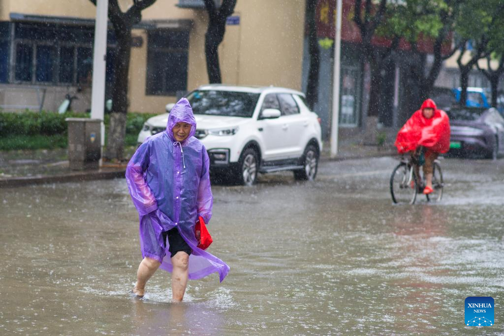 Un residente vadea a través de un área anegada, en la ciudad de Zhoushan, en la provincia de Zhejiang, en el este de China, el 30 de julio de 2025. Co-may, el octavo tifón de este año, tocó tierra en la provincia oriental china de Zhejiang alrededor de las 4:30 horas del miércoles, informó el observatorio meteorológico provincial. Co-May, cuya fuerza máxima del viento cerca de su centro alcanza los 23 metros por segundo, tocó tierra en la ciudad de Zhoushan. (Xinhua/Jiang Han)