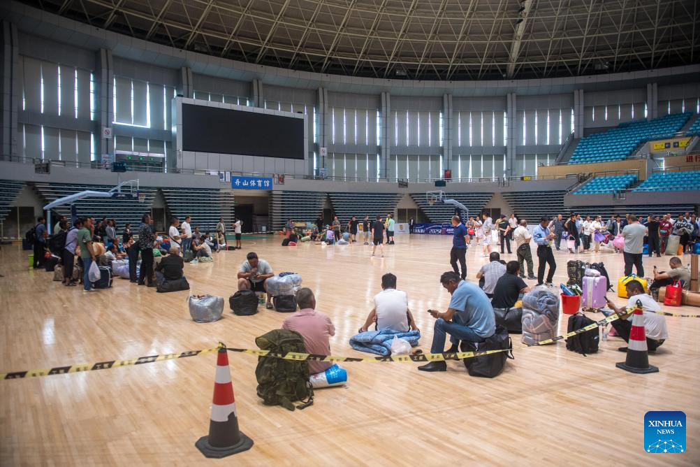 Residentes se refugian en un estadio convertido en un sitio de reubicación, en la ciudad de Zhoushan, en la provincia de Zhejiang, en el este de China, el 30 de julio de 2025. Co-may, el octavo tifón de este año, tocó tierra en la provincia oriental china de Zhejiang alrededor de las 4:30 horas del miércoles, informó el observatorio meteorológico provincial. Co-May, cuya fuerza máxima del viento cerca de su centro alcanza los 23 metros por segundo, tocó tierra en la ciudad de Zhoushan. (Xinhua/Jiang Han)
