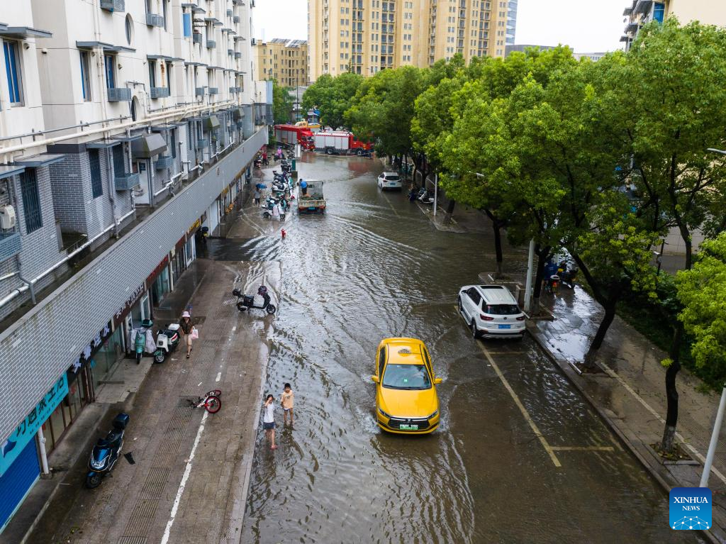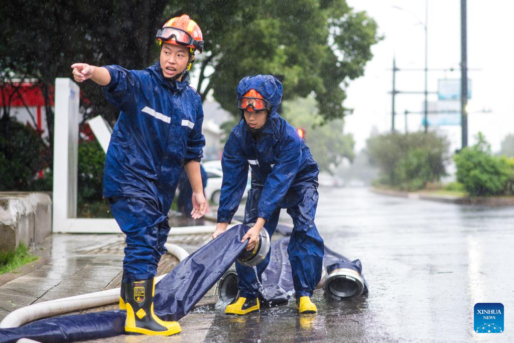 Bomberos drenan agua de una calle, en la ciudad de Zhoushan, en la provincia de Zhejiang, en el este de China, el 30 de julio de 2025. Co-may, el octavo tifón de este año, tocó tierra en la provincia oriental china de Zhejiang alrededor de las 4:30 horas del miércoles, informó el observatorio meteorológico provincial. Co-May, cuya fuerza máxima del viento cerca de su centro alcanza los 23 metros por segundo, tocó tierra en la ciudad de Zhoushan. (Xinhua/Jiang Han)