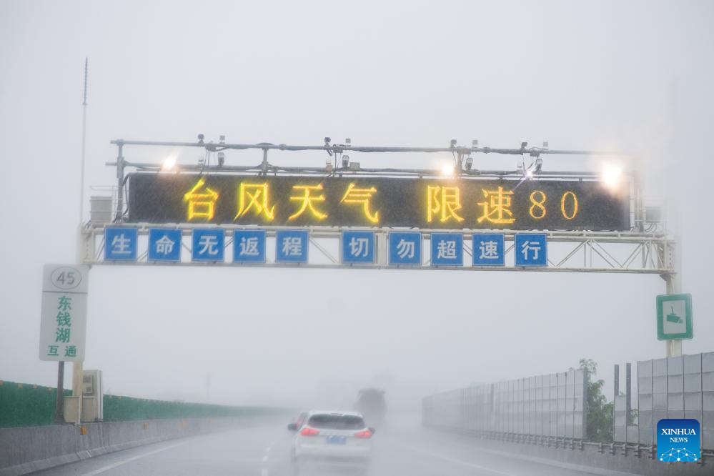 Un límite de velocidad es impuesto en algunas autopistas mientras el tifón Co-May toca tierra, en la provincia de Zhejiang, en el este de China, el 30 de julio de 2025. Co-may, el octavo tifón de este año, tocó tierra en la provincia oriental china de Zhejiang alrededor de las 4:30 horas del miércoles, informó el observatorio meteorológico provincial. Co-May, cuya fuerza máxima del viento cerca de su centro alcanza los 23 metros por segundo, tocó tierra en la ciudad de Zhoushan. (Xinhua/Jiang Han)