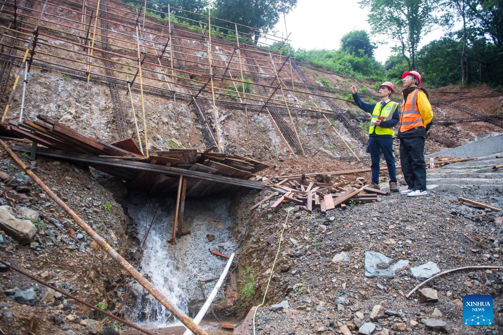 Empleados patrullan un área con alto riesgo de desastres geológicos, en la ciudad de Zhoushan, en la provincia de Zhejiang, en el este de China, el 30 de julio de 2025. Co-may, el octavo tifón de este año, tocó tierra en la provincia oriental china de Zhejiang alrededor de las 4:30 horas del miércoles, informó el observatorio meteorológico provincial. Co-May, cuya fuerza máxima del viento cerca de su centro alcanza los 23 metros por segundo, tocó tierra en la ciudad de Zhoushan. (Xinhua/Jiang Han)