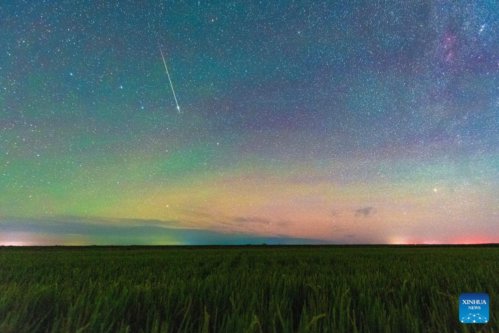 HARBIN, 1 agosto, 2025 (Xinhua) -- Imagen de larga exposición del 30 de julio de 2025 de una lluvia de meteoritos sobre la ciudad de Fujin, en la provincia de Heilongjiang, en el noreste de China. Varias lluvias de meteoritos iluminaron recientemente el cielo nocturno en la provincia de Heilongjiang, en el noreste de China. (Xinhua/Qu Yubao)