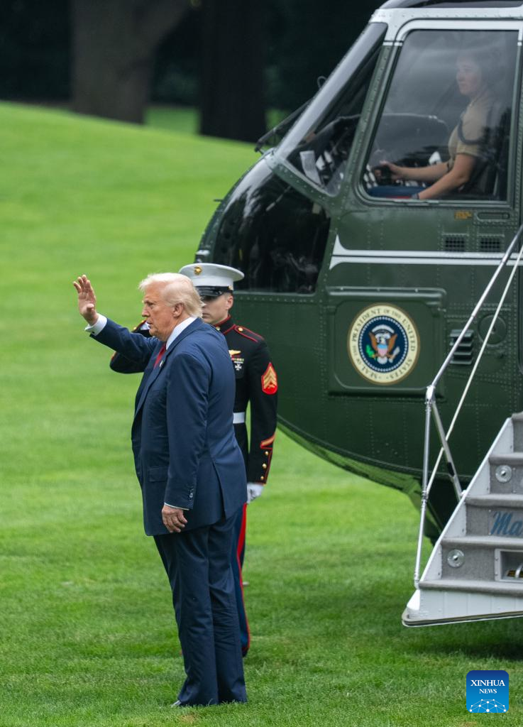 El presidente estadounidense, Donald Trump, saluda antes de abordar el Marine One en la Casa Blanca, en Washington D.C., Estados Unidos, el 1 de agosto de 2025. El presidente de Estados Unidos, Donald Trump, anunció el viernes que ordenó el despido de Erika McEntarfer, comisionada de la Oficina de Estadísticas Laborales (BLS, por sus siglas en inglés), a quien acusó de manipular la información con fines políticos. (Xinhua/Hu Yousong)