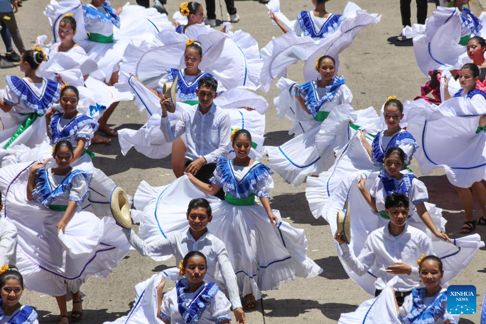 SAN SALVADOR, 1 agosto, 2025 (Xinhua) -- Un grupo de danza folclórica participa en un desfile durante la inauguración de la temporada vacacional de las Fiestas Agostinas, en el departamento de San Salvador, El Salvador, el 1 de agosto de 2025. (Xinhua/Alexander Peña)