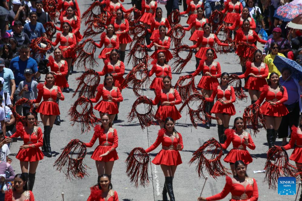 SAN SALVADOR, 1 agosto, 2025 (Xinhua) -- Porristas participan en un desfile durante la inauguración de la temporada vacacional de las Fiestas Agostinas, en el departamento de San Salvador, El Salvador, el 1 de agosto de 2025. (Xinhua/Alexander Peña)