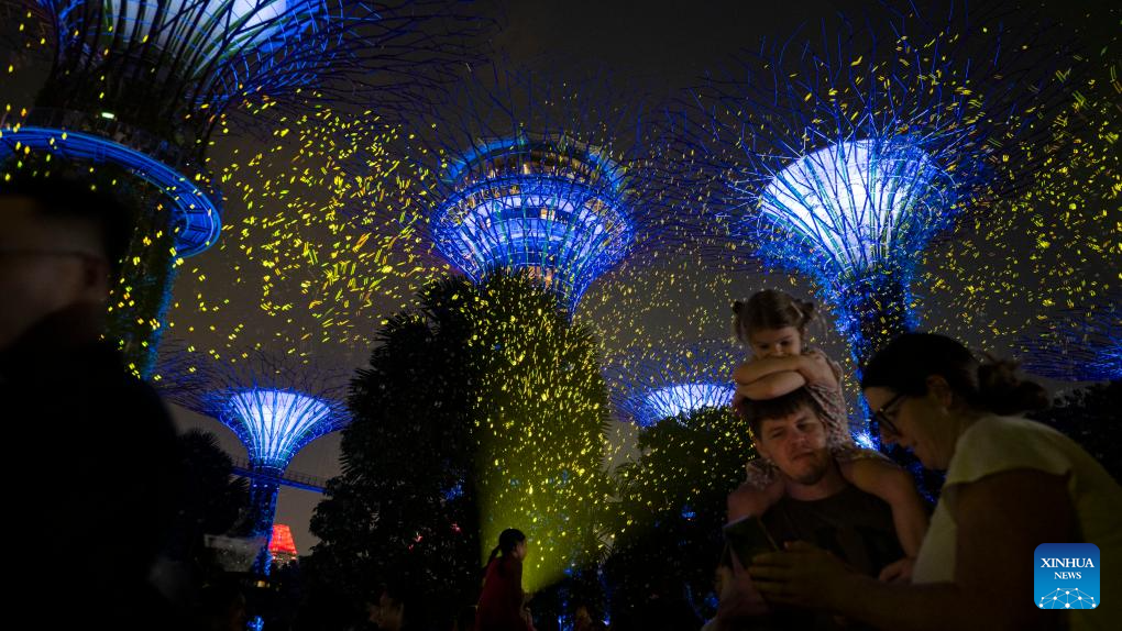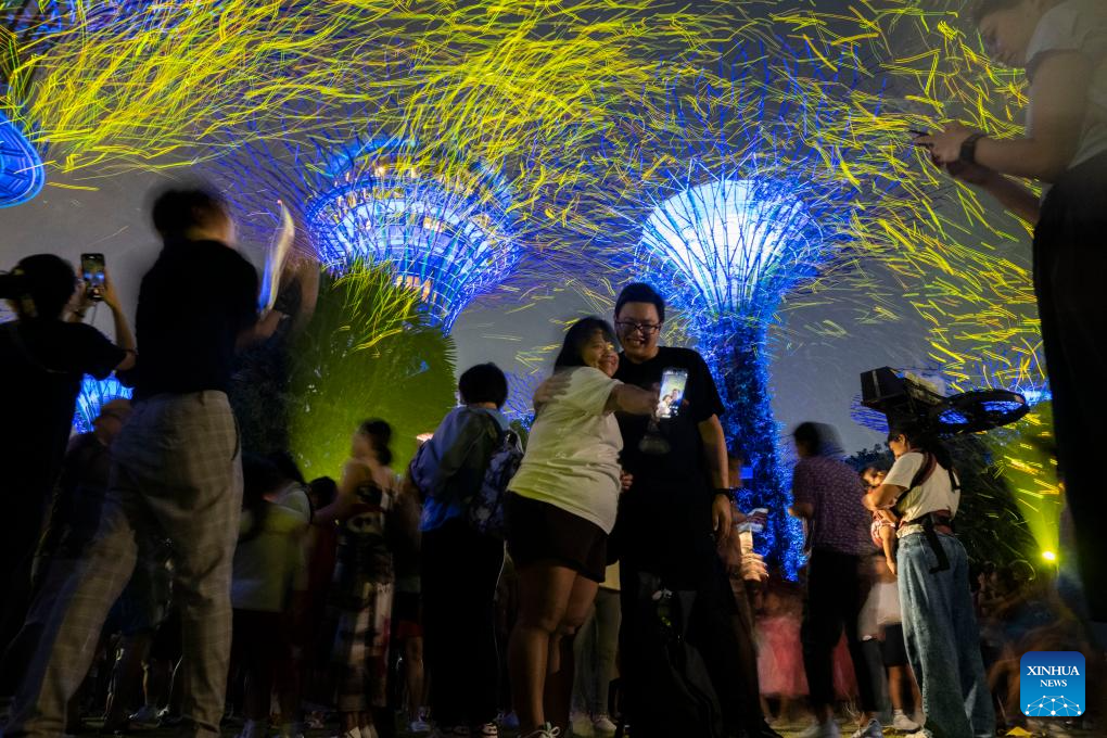 SINGAPUR, 1 agosto, 2025 (Xinhua) -- Turistas visitan la instalación de luces SPARK, con forma de luciérnagas, como parte de las actividades de celebración por el 60 aniversario de la Independencia de Singapur, llevada a cabo en los Jardines de la Bahía de Singapur, el 1 de agosto de 2025. (Xinhua/Then Chih Wey)
