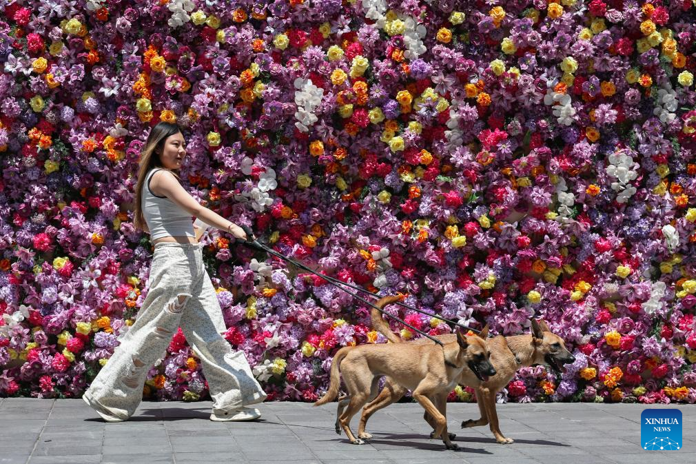 CHONGQING, 2 agosto, 2025 (Xinhua) -- Una mujer pasea a sus perros bajo el sol, en el distrito de Jiangbei, en la municipalidad de Chongqing, en el suroeste de China, el 2 de agosto de 2025. Chongqing emitió el sábado una alerta por ola de calor, con temperaturas máximas alcanzando los 40-43 grados centígrados. (Xinhua/Chen Cheng)
