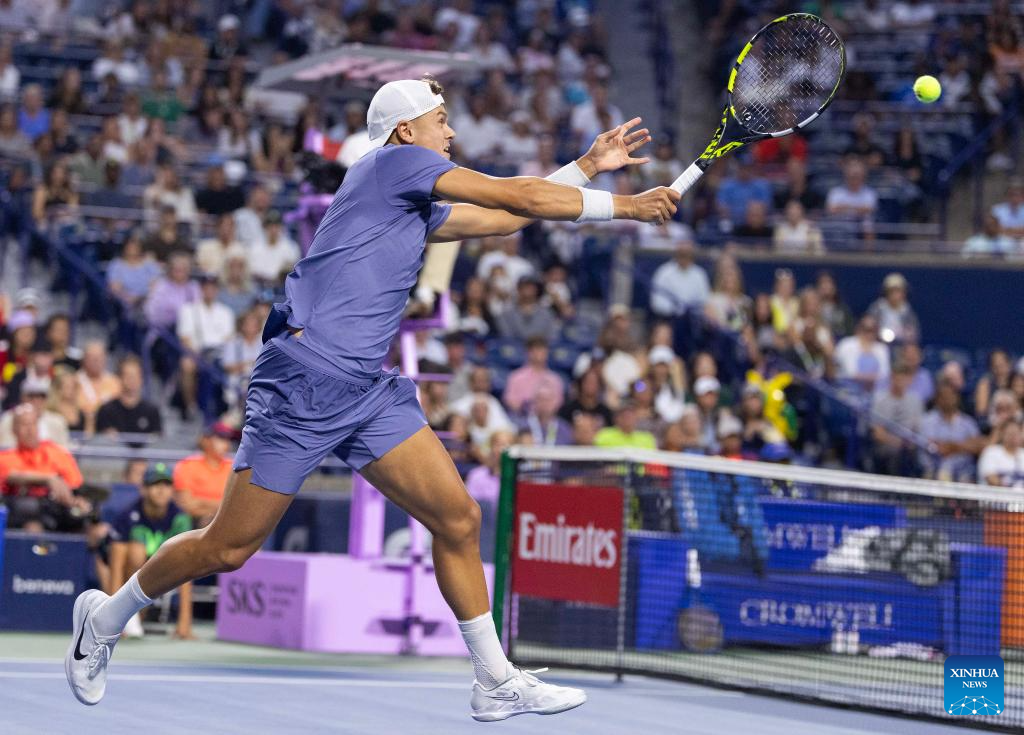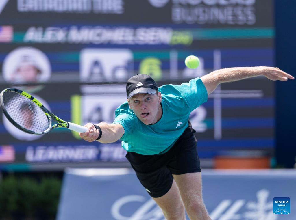 TORONTO, 3 agosto, 2025 (Xinhua) -- Imagen del 2 de agosto de 2025 de Alex Michelsen, de Estados Unidos, devolviendo la pelota durante el partido de octavos de final de individuales masculinos entre Alex Michelsen, de Estados Unidos, y Learner Tien, de Estados Unidos, en el torneo de tenis Abierto National Bank 2025, en Toronto, Canadá. (Xinhua/Zou Zheng)