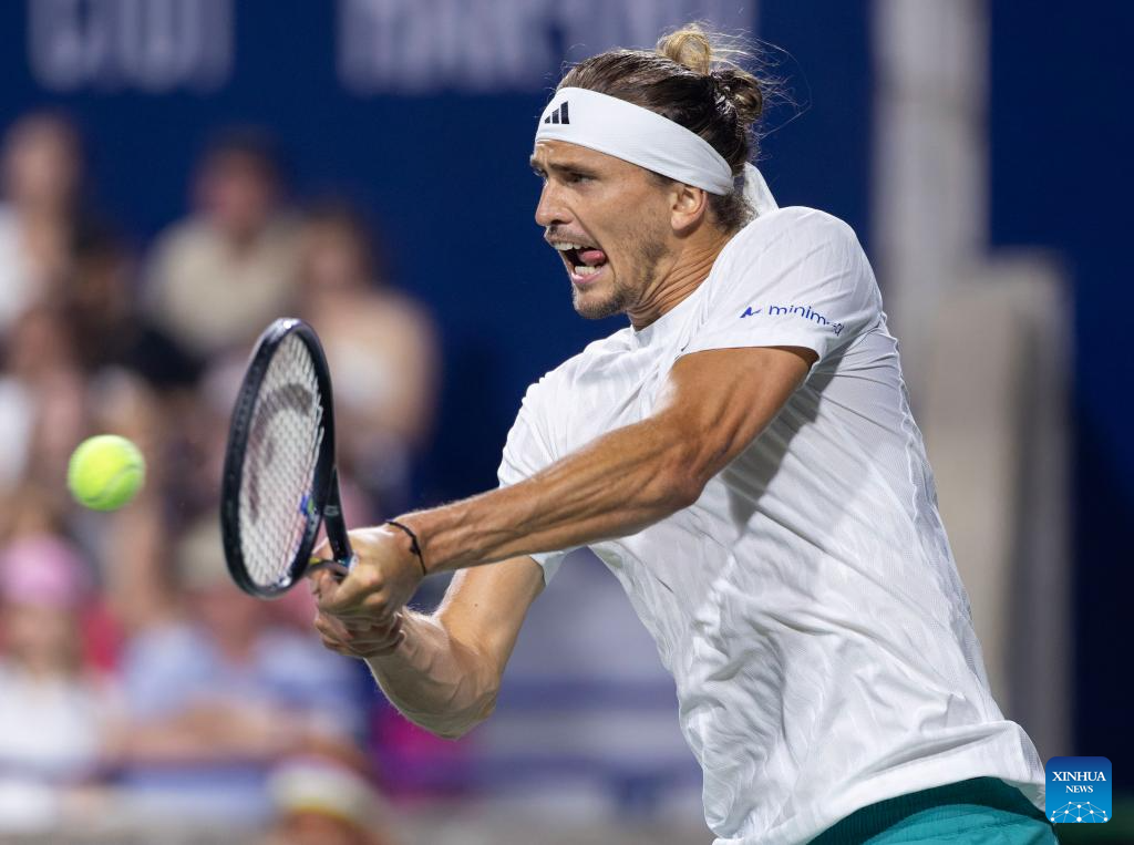 TORONTO, 3 agosto, 2025 (Xinhua) -- Imagen del 2 de agosto de 2025 de Alexander Zverev devolviendo la pelota durante el partido de octavos de final de individuales masculinos entre Alexander Zverev, de Alemania, y Francisco Cerúndolo, de Argentina, en el torneo de tenis Abierto National Bank 2025, en Toronto, Canadá. (Xinhua/Zou Zheng)