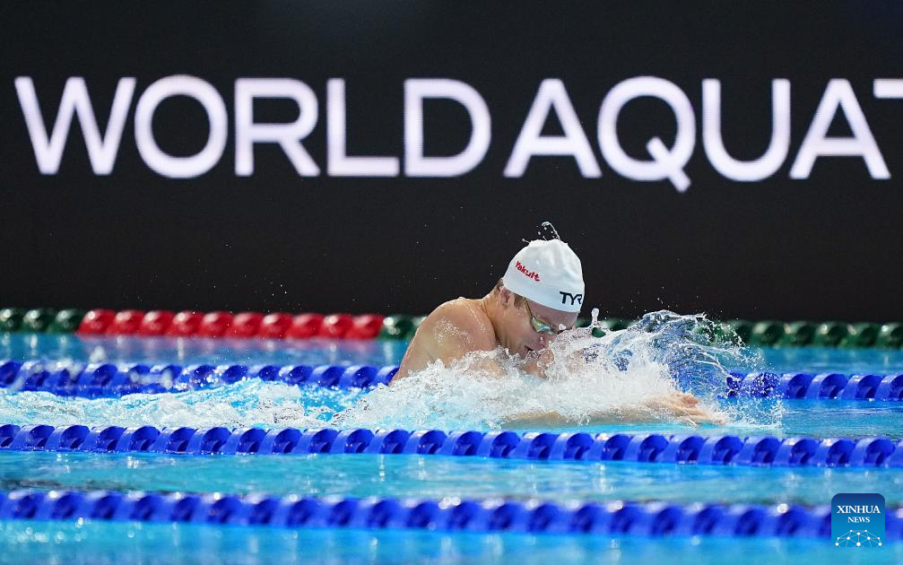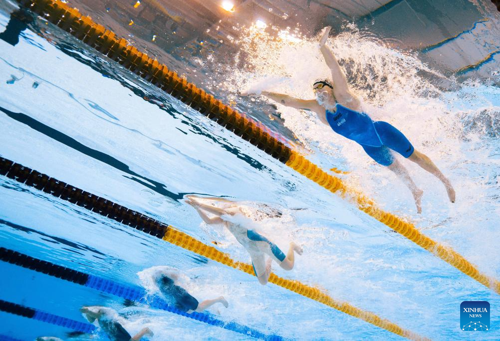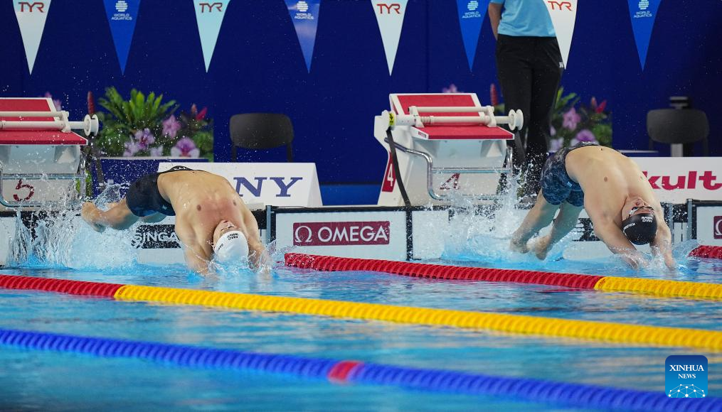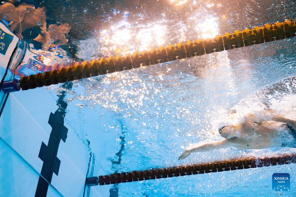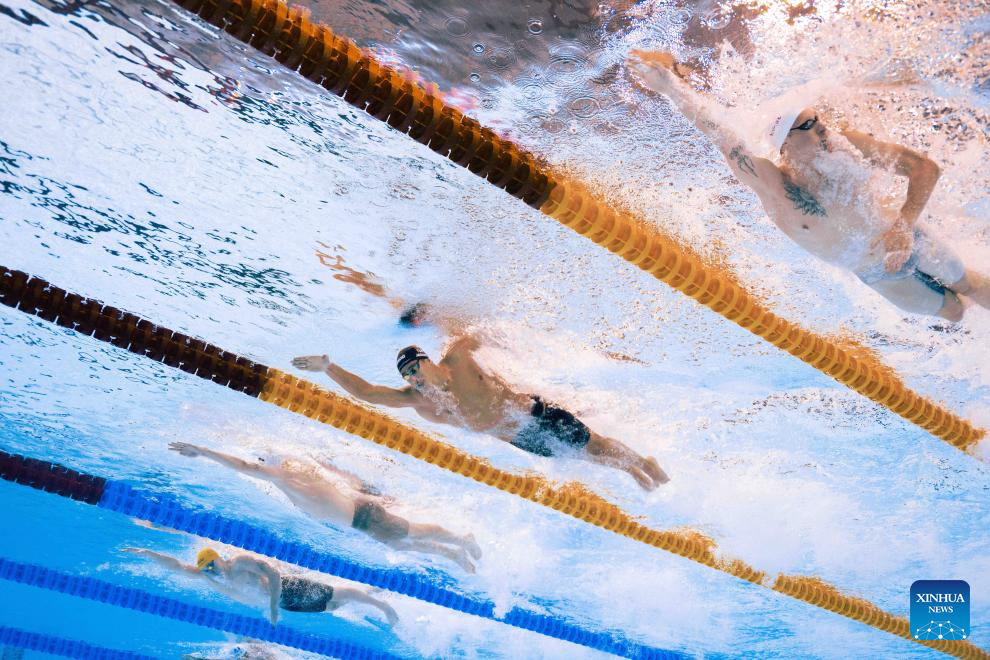 SINGAPUR, 3 agosto, 2025 (Xinhua) -- Ahmed Jaouadi (c), de Túnez, compitiendo durante la final de 1500m de estilo libre masculino de natación en el Campeonato Mundial de Deportes Acuáticos, en Singapur, el 3 de agosto de 2025. (Xinhua/Xue Yuge)