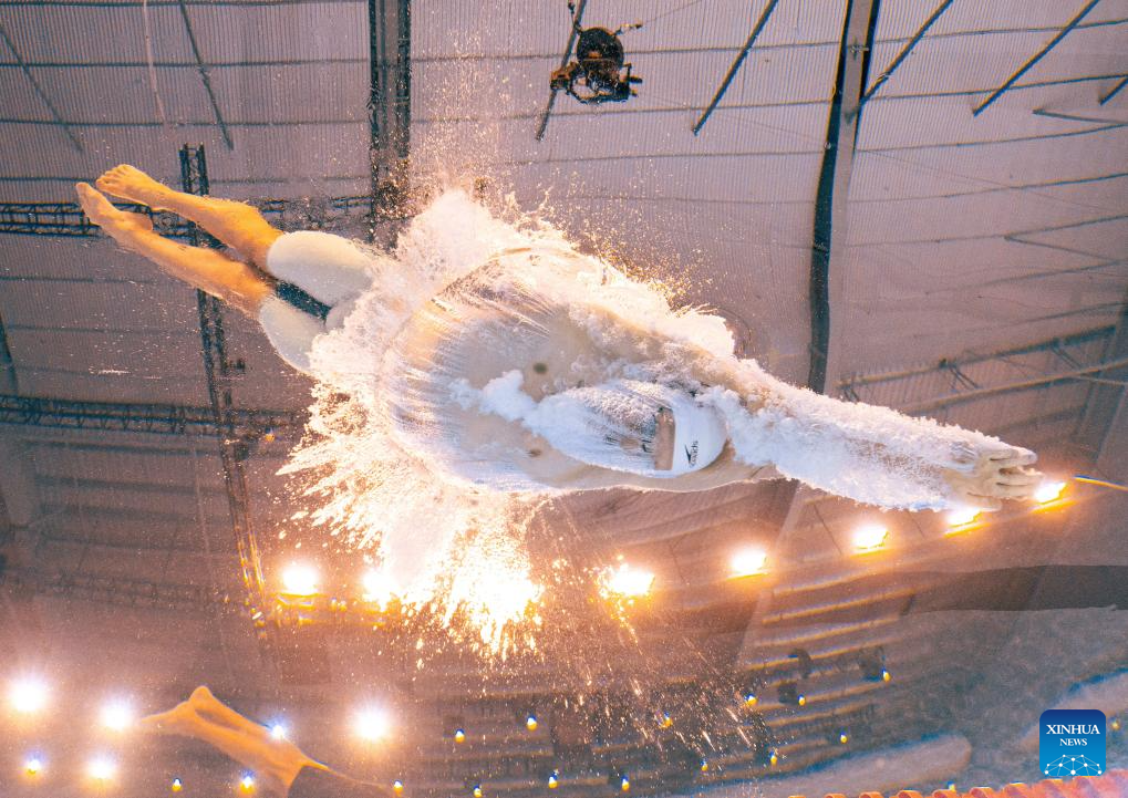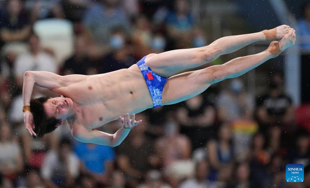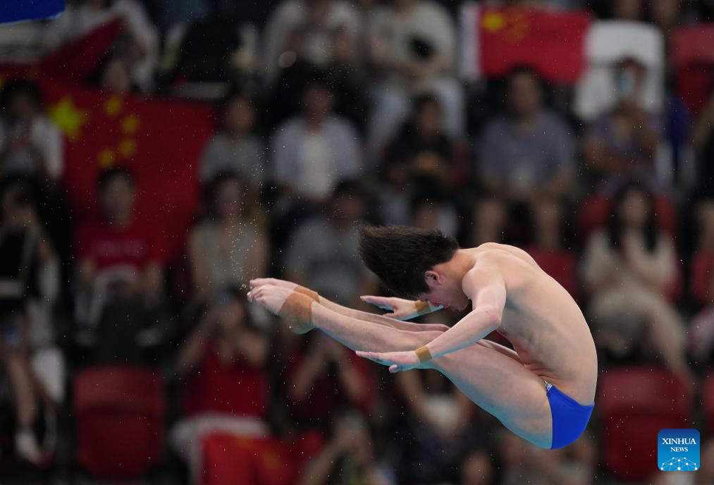 SINGAPUR, 3 agosto, 2025 (Xinhua) -- Zhu Zifeng, de China, compite durante la final de plataforma de 10m masculina de clavados en el Campeonato Mundial de Deportes Acuáticos, en Singapur, el 3 de agosto de 2025. (Xinhua/Wu Zhizun)