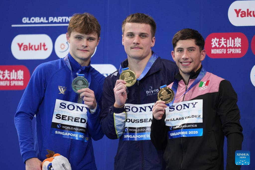 SINGAPUR, 3 agosto, 2025 (Xinhua) -- El medallista de oro, Cassiel Rousseau (c), de Australia, el medallista de plata, Oleksii Sereda (i), de Ucrania, y el medallista de bronce, Randal Willars Valdez, de México, posan durante la ceremonia de premiación de plataforma de 10m masculina de clavados en el Campeonato Mundial de Deportes Acuáticos, en Singapur, el 3 de agosto de 2025. (Xinhua/Wu Zhizun)