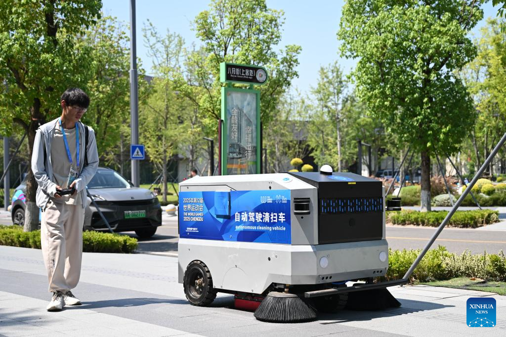 CHENGDU, 3 agosto, 2025 (Xinhua) -- Un empleado opera un vehículo de limpieza autónoma en la villa TWG para los Juegos Mundiales (TWG, por sus siglas en inglés) de Chengdu 2025, en Chengdu, en la provincia de Sichuan, en el suroeste de China, el 3 de agosto de 2025. (Xinhua/Xu Bingjie)