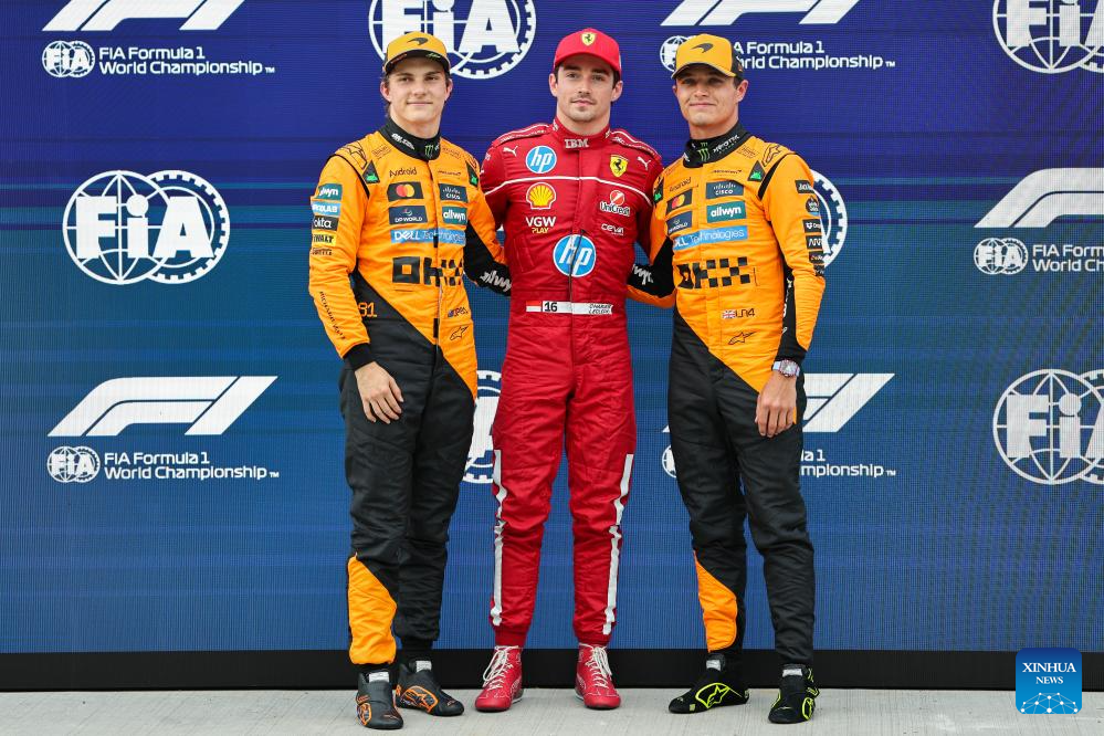 BUDAPEST, 3 agosto, 2025 (Xinhua) -- Imagen del 2 de agosto de 2025 del ganador de la pole position, el piloto monegasco de la escudería Ferrari, Charles Leclerc (c), el ganador del segundo lugar, el piloto australiano de la escudería McLaren, Oscar Piastri y el ganador del tercer lugar, el piloto británico de la escudería McLaren, Lando Norris, posando al término de la sesión de clasificación del Gran Premio de Hungría de Fórmula Uno, en el Hungaroring, en Mogyorod, cerca de Budapest, Hungría. (Xinhua/Qian Jun)