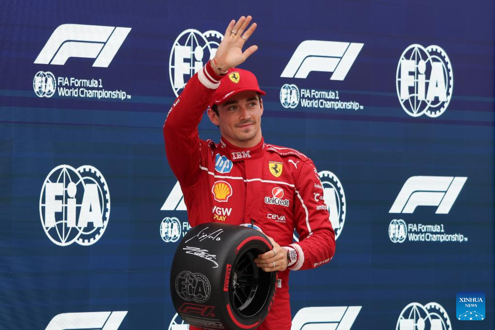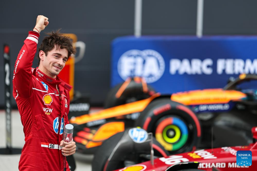 BUDAPEST, 3 agosto, 2025 (Xinhua) -- Imagen del 2 de agosto de 2025 del ganador de la pole position, el piloto monegasco de la escudería Ferrari, Charles Leclerc, festejando al término de la sesión de clasificación del Gran Premio de Hungría de Fórmula Uno, en el Hungaroring, en Mogyorod, cerca de Budapest, Hungría. (Xinhua/Attila Volgyi)