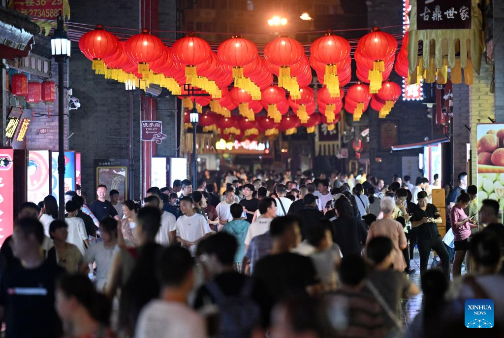 TIANJIN, 4 agosto, 2025 (Xinhua) -- Imagen del 3 de agosto de 2025 de turistas visitando una calle cultural antigua, en la municipalidad de Tianjin, en el norte de China. Los propietarios de los comercios locales han ampliado sus horarios de atención y organizado espectáculos en vivo para atraer visitantes, impulsando la economía del verano. (Xinhua/Zhao Zishuo)