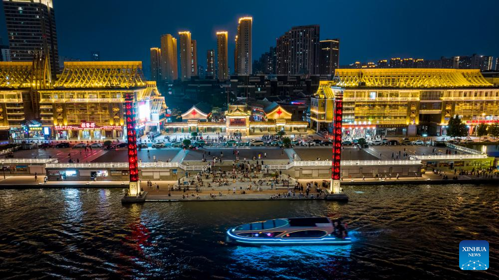 TIANJIN, 4 agosto, 2025 (Xinhua) -- Vista aérea tomada con un dron el 3 de agosto de 2025 de una calle cultural antigua, en la municipalidad de Tianjin, en el norte de China. Los propietarios de los comercios locales han ampliado sus horarios de atención y organizado espectáculos en vivo para atraer visitantes, impulsando la economía del verano. (Xinhua/Zhao Zishuo)
