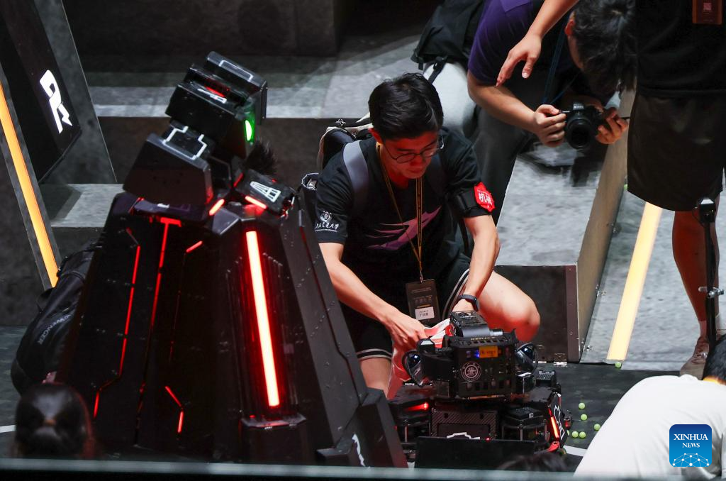 (250804) -- SHENZHEN, 4 agosto, 2025 (Xinhua) -- Imagen del 3 de agosto de 2025 de un miembro del equipo Jiaoloong, de la Universidad Jiao Tong de Shanghai, configurando un robot durante la final del Campeonato Universitario RoboMaster (RMUC 2025, por sus siglas en inglés) de la 24ª Competencia Universitaria de Robots de China, en Shenzhen, en la provincia de Guangdong, en el sur de China. La competencia concluyó aquí el domingo, con el equipo de Jiaoloong de la Universidad Jiao Tong de Shanghai, ganando el campeonato. (Xinhua/Mao Siqian) (rtg) (ah) (ce)