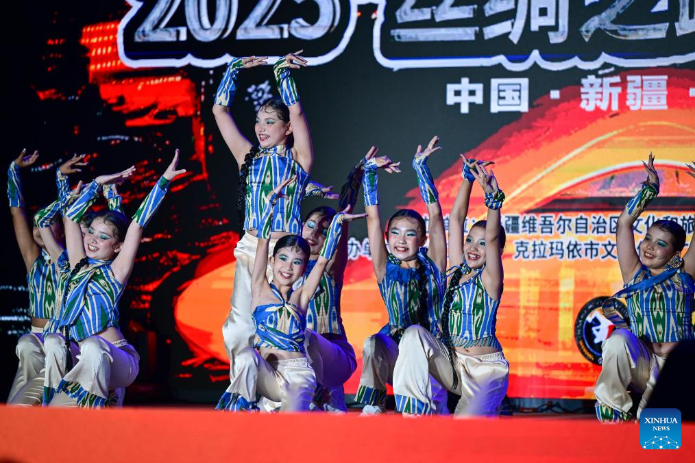 KARAMAY, 4 agosto, 2025 (Xinhua) -- Imagen del 3 de agosto de 2025 de bailarinas realizando una presentación durante un espectáculo de danza callejero, en Karamay, en la región autónoma uygur de Xinjiang, en el noroeste de China. El espectáculo de baile callejero, celebrado como parte del VII Festival Internacional de Danza de Xinjiang de China, tuvo lugar el domingo en la ciudad de Karamay. Más de 600 bailarines nacionales e internacionales actuaron en el escenario, ofreciendo un espectáculo cautivador para el público. (Xinhua/Ding Lei)