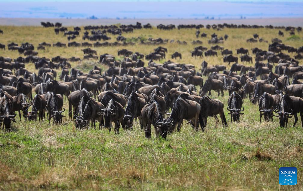 NAIROBI, 4 agosto, 2025 (Xinhua) -- Imagen del 31 de julio de 2025 de ñus pastando en la pradera de la Reserva Nacional Masai Mara, en Kenia. (Xinhua/Han Xu)