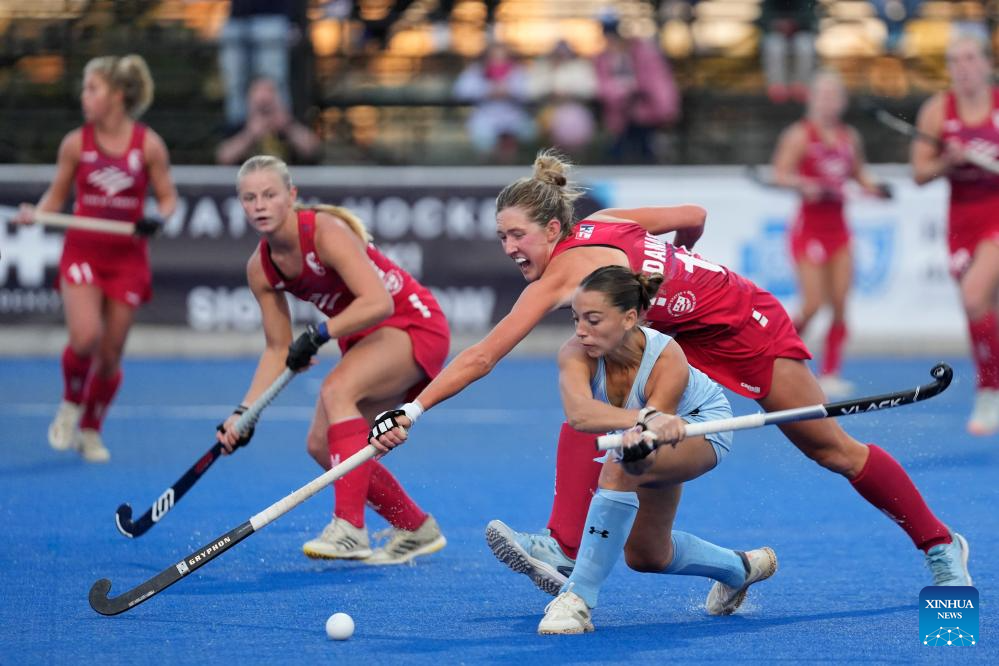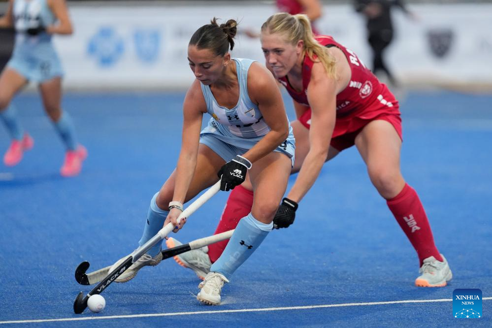 MONTEVIDEO, 4 agosto, 2025 (Xinhua) -- Imagen del 3 de agosto de 2025 de la jugadora Brisa Bruggesser (i), de Argentina, disputando la pelota con Caroline Ramsey (d), de Estados Unidos, durante la final femenina de la Copa Panamericana de Hockey sobre Césped, en Carrasco, en Montevideo, capital de Uruguay. (Xinhua/Nicolás Celaya)