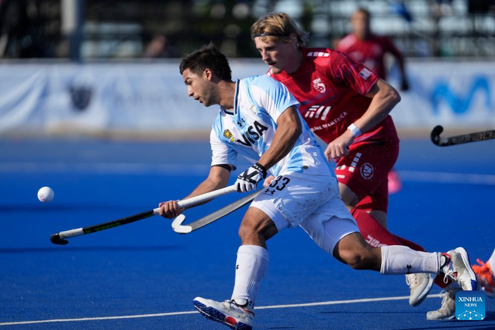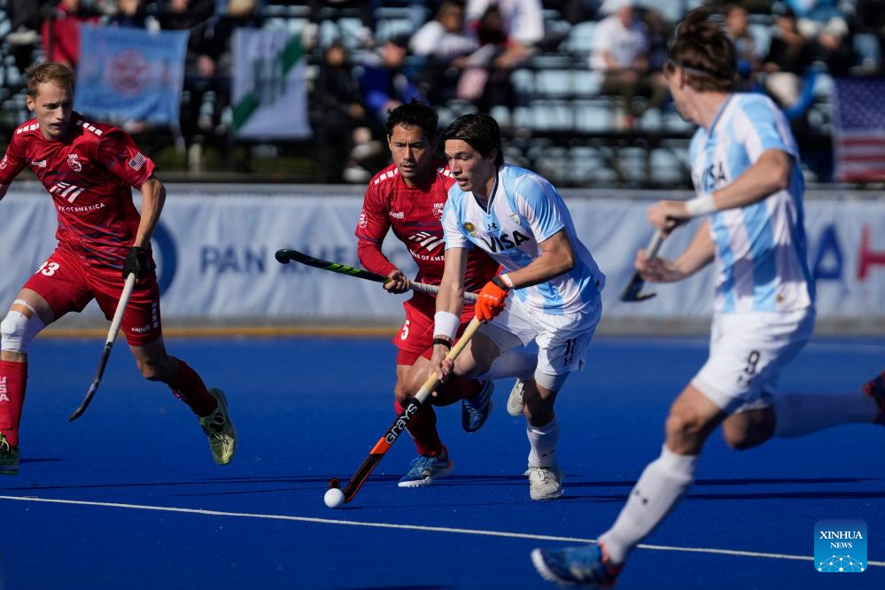 MONTEVIDEO, 4 agosto, 2025 (Xinhua) -- Imagen del 3 de agosto de 2025 del jugador Lucas Toscani (2-d), de Argentina, disputando la pelota con Pat Harris (2-i), de Estados Unidos, durante la final masculina de la Copa Panamericana de Hockey sobre Césped, en Carrasco, en Montevideo, capital de Uruguay. (Xinhua/Nicolás Celaya)
