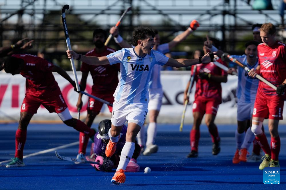 MONTEVIDEO, 4 agosto, 2025 (Xinhua) -- Imagen del 3 de agosto de 2025 del jugador Bautista Capurro (c), de Argentina, festejando su anotación, durante la final masculina de la Copa Panamericana de Hockey sobre Césped, ante Estados Unidos, en Carrasco, en Montevideo, capital de Uruguay. (Xinhua/Nicolás Celaya)