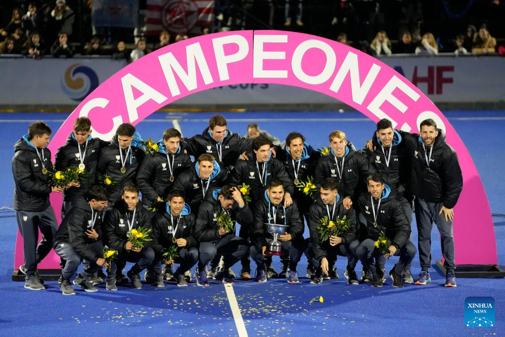 MONTEVIDEO, 4 agosto, 2025 (Xinhua) -- Imagen del 3 de agosto de 2025 de jugadores de Argentina festejando tras obtener el trofeo al término de la final masculina de la Copa Panamericana de Hockey sobre Césped, ante Estados Unidos, en Carrasco, en Montevideo, capital de Uruguay. (Xinhua/Nicolás Celaya)