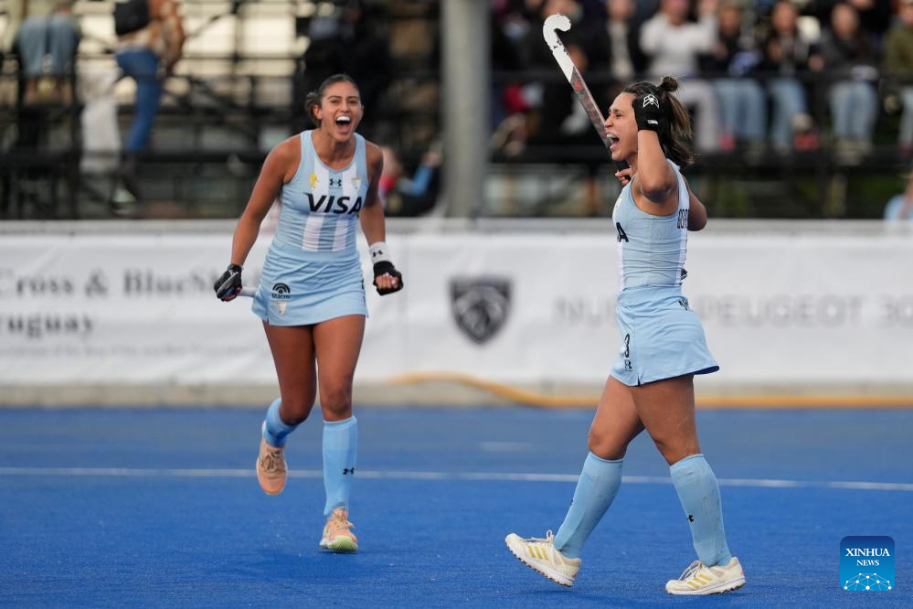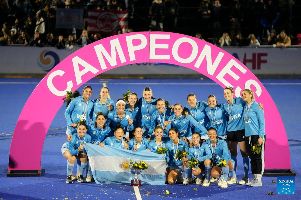 MONTEVIDEO, 4 agosto, 2025 (Xinhua) -- Imagen del 3 de agosto de 2025 de jugadoras de Argentina festejando tras obtener el trofeo al término de la final femenina de la Copa Panamericana de Hockey sobre Césped, ante Estados Unidos, en Carrasco, en Montevideo, capital de Uruguay. (Xinhua/Nicolás Celaya)