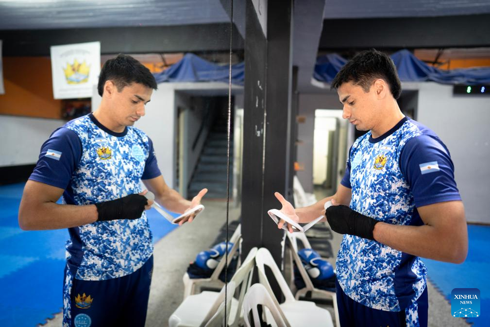 BUENOS AIRES, 6 agosto, 2025 (Xinhua) -- Imagen del 5 de agosto de 2025 del luchador argentino de kickboxing, Matías García, preparándose para una sesión de entrenamiento, en la ciudad de Buenos Aires, capital de Argentina. García afirmó que sus expectativas son "gigantescas" para competir en los Juegos Mundiales de Chengdu 2025 y llevar consigo la medalla de oro en la categoría K1. (Xinhua/Martín Zabala)
