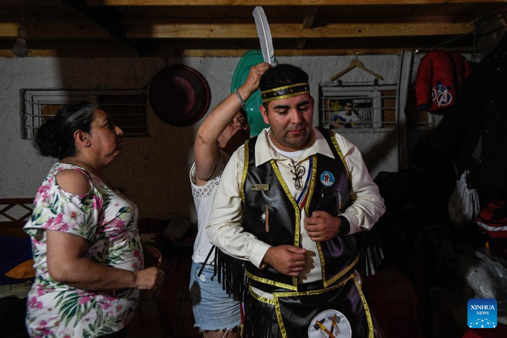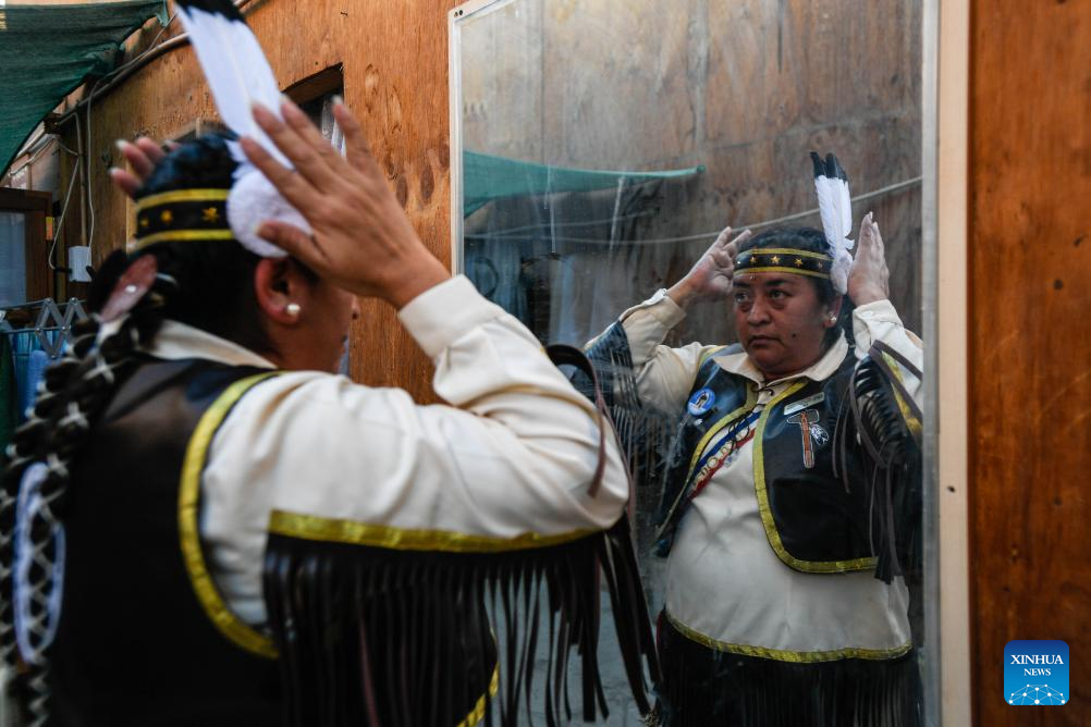 LA TIRANA, 6 agosto, 2025 (Xinhua) -- Imagen del 16 de julio de 2025 de bailarines de la Sociedad de Pieles Rojas preparándose para participar en la Fiesta de la Tirana, en el poblado de La Tirana, en la comuna de Pozo Almonte, en la región de Tarapacá, Chile. Los integrantes de uno de los bailes de la Sociedad Pieles Rojas Pedro de Valdivia afinan los últimos detalles para danzarle a la Virgen del Carmen, en medio del jolgorio, felicidad y esperanza de la Fiesta de La Tirana, la celebración religiosa más importante de Chile. (Xinhua/Jorge Villegas)