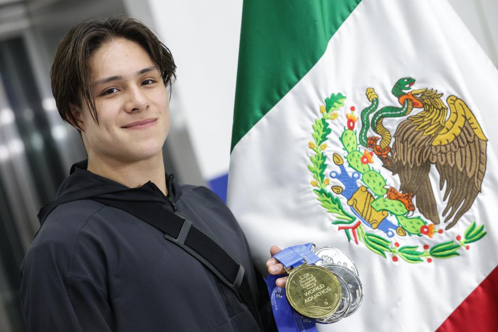 CIUDAD DE MEXICO, 5 agosto, 2025 (Xinhua) -- El clavadista mexicano, Osmar Olvera Ibarra, posa con sus medallas para una fotografía a su regreso del Campeonato Mundial de Deportes Acuáticos celebrado en Singapur, en el Aeropuerto Internacional de la Ciudad de México, en la Ciudad de México, capital de México, el 5 de agosto de 2025. (Xinhua/Francisco Cañedo)
