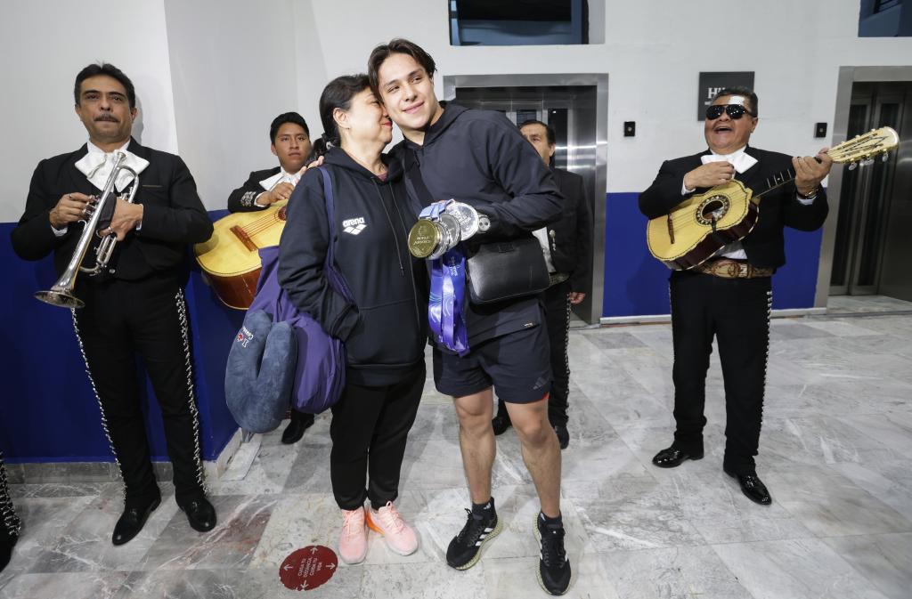 CIUDAD DE MEXICO, 5 agosto, 2025 (Xinhua) -- El clavadista mexicano, Osmar Olvera Ibarra (i-frente), se toma una fotografía con un dispositivo móvil a su regreso del Campeonato Mundial de Deportes Acuáticos celebrado en Singapur, en el Aeropuerto Internacional de la Ciudad de México, en la Ciudad de México, capital de México, el 5 de agosto de 2025. (Xinhua/Francisco Cañedo)