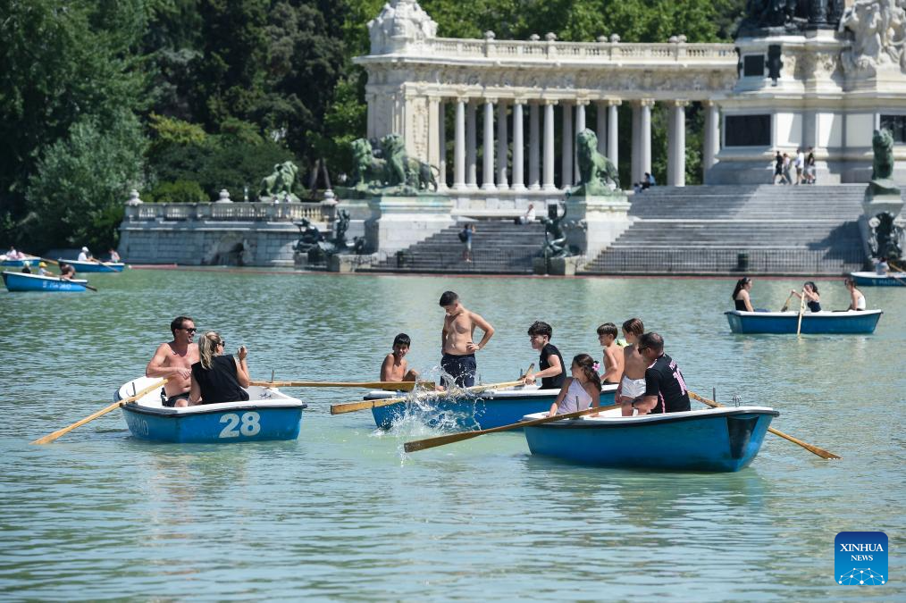 MADRID, 5 agosto, 2025 (Xinhua) -- Imagen del 4 de agosto de 2025 de personas remando en botes en un jardín, en Madrid, España. Alertas por golpe de calor fueron emitidas en muchos lugares de España mientras el país se ve afectado por una abrasadora ola de calor. (Xinhua/Gustavo Valiente)