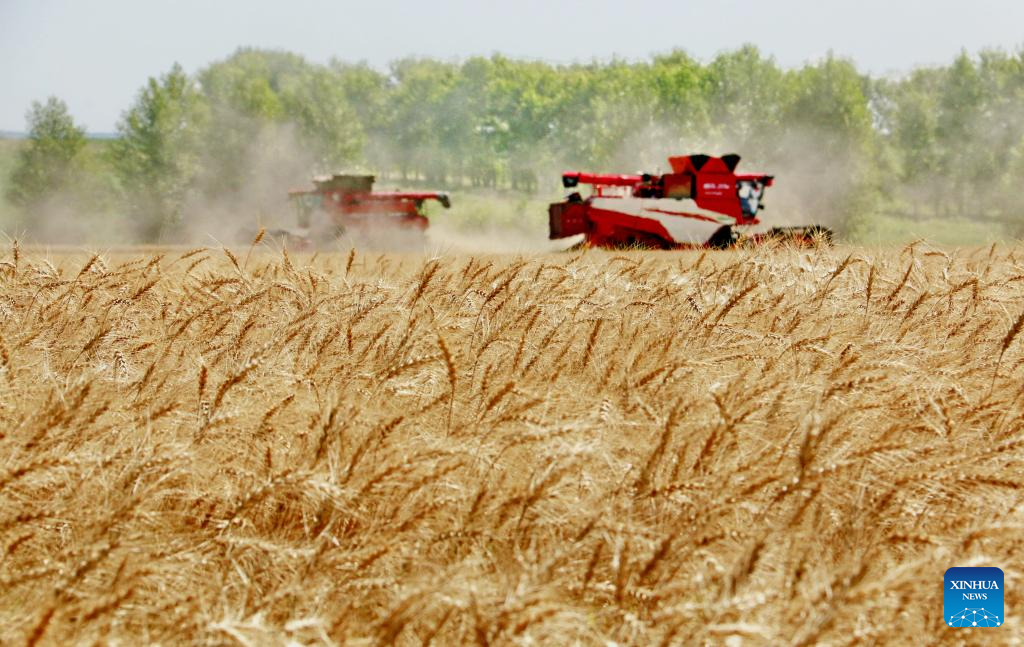 HARBIN, 5 agosto, 2025 (Xinhua) -- Segadoras cosechan trigo en el campo, en la ciudad de Heihe, en la provincia de Heilongjiang, en el noreste de China, el 5 de agosto de 2025. La provincia de Heilongjiang, un importante productor agrícola conocida como "el granero de China", ha visto cómo sus cultivos entrar en la etapa de maduración. (Xinhua/Lu Wenxiang)