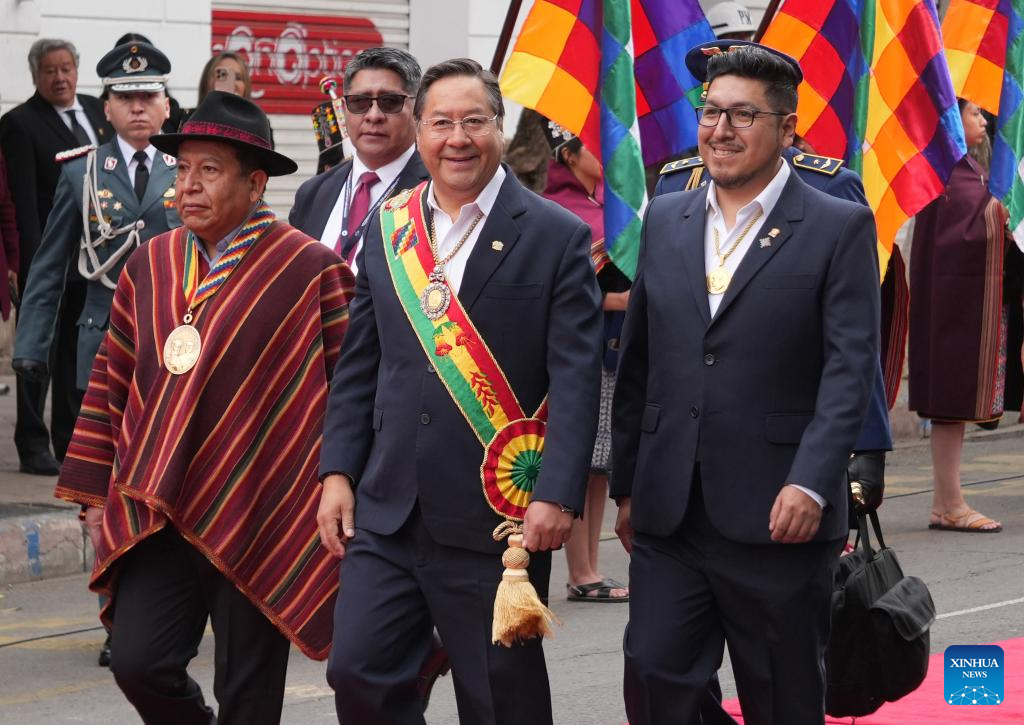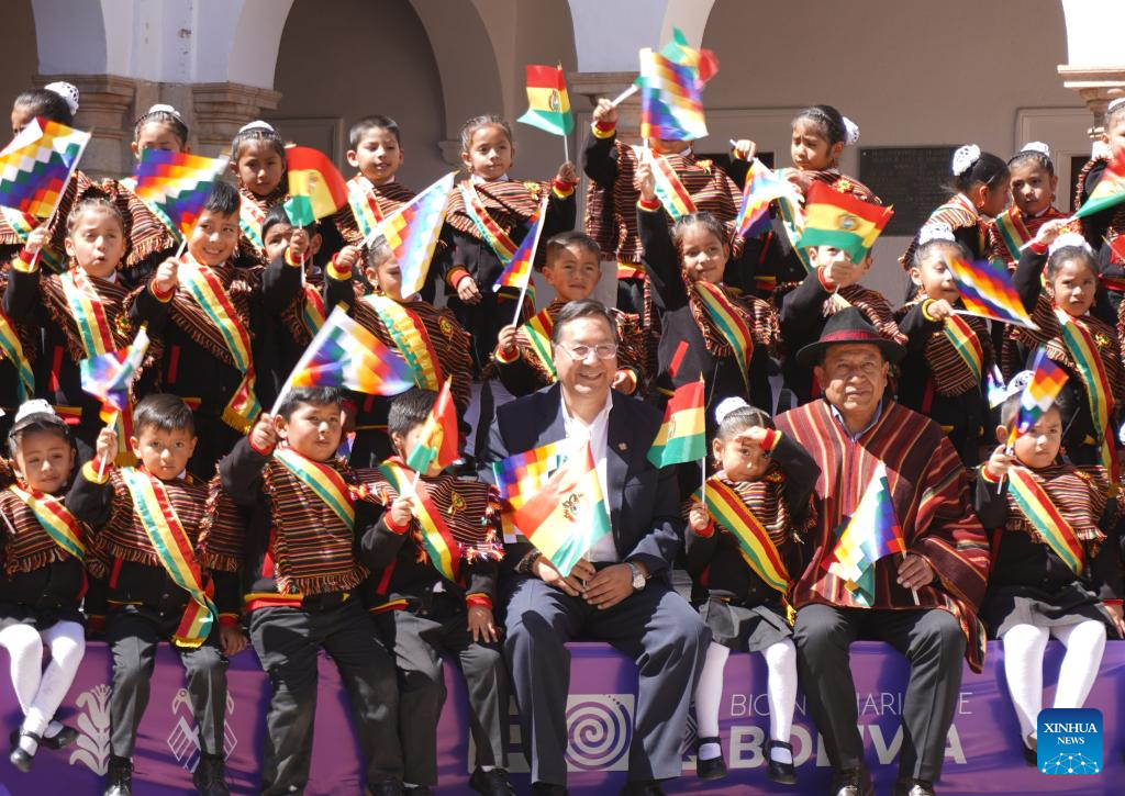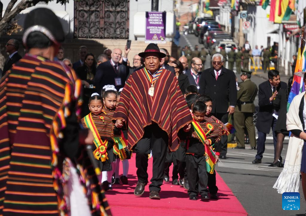 SUCRE, 6 agosto, 2025 (Xinhua) -- El presidente de Bolivia, Luis Arce (c-frente), y el vicepresidente boliviano, David Choquehuanca (2-d-frente), participan en el inicio de los actos conmemorativos por el Bicentenario de la Independencia, en la Plaza 25 de Mayo, en la ciudad de Sucre, Bolivia, el 6 de agosto de 2025. La ciudad de Sucre, capital constitucional de Bolivia y cuna de su independencia, se convirtió el miércoles en el epicentro de una histórica conmemoración: el Bicentenario de la independencia nacional. La ceremonia contó con la participación de más de un centenar de autoridades y representantes internacionales, informó la cancillería boliviana.(Xinhua/Javier Mamani)