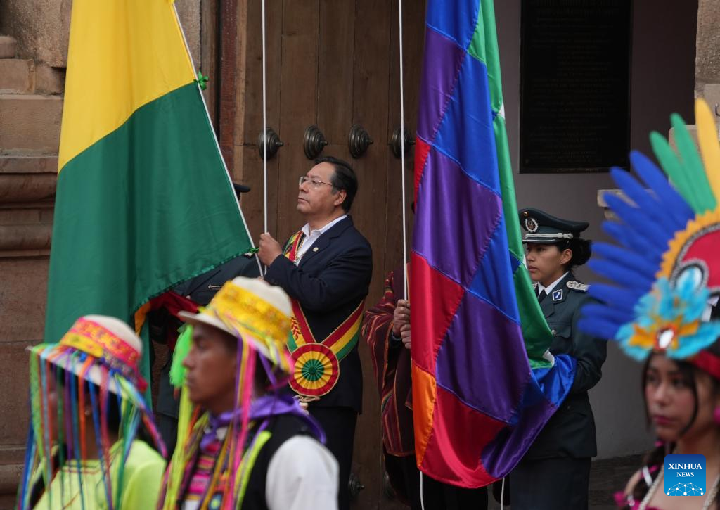 SUCRE, 6 agosto, 2025 (Xinhua) -- El presidente de Bolivia, Luis Arce (i-atrás), iza la bandera nacional boliviana en el inicio de los actos conmemorativos por el Bicentenario de la Independencia, en la Plaza 25 de Mayo, en la ciudad de Sucre, Bolivia, el 6 de agosto de 2025. La ciudad de Sucre, capital constitucional de Bolivia y cuna de su independencia, se convirtió el miércoles en el epicentro de una histórica conmemoración: el Bicentenario de la independencia nacional. La ceremonia contó con la participación de más de un centenar de autoridades y representantes internacionales, informó la cancillería boliviana.(Xinhua/Javier Mamani)