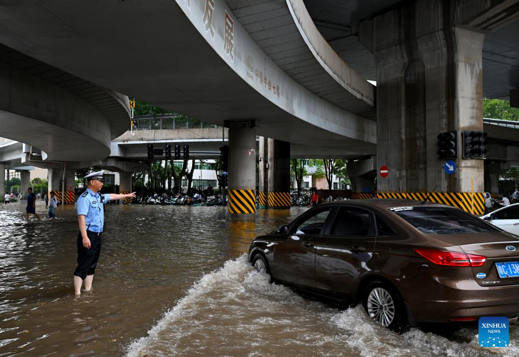 ZHENGZHOU, 7 agosto, 2025 (Xinhua) -- Un oficial de policía dirige el tránsito en una intersección, en Zhengzhou, en la provincia de Henan, en el centro de China, el 7 de agosto de 2025. Zhengzhou fue azotada por fuertes lluvias el jueves. (Xinhua/Hao Yuan)