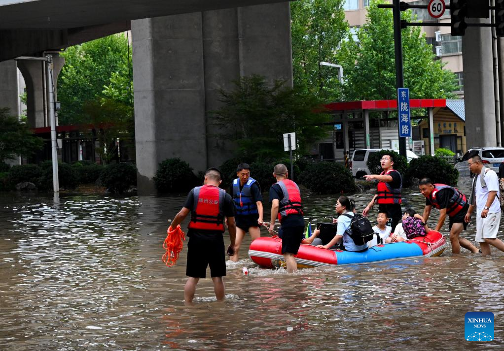 ZHENGZHOU, 7 agosto, 2025 (Xinhua) -- Trabajadores trasladan a los ciudadanos en una intersección, en Zhengzhou, en la provincia de Henan, en el centro de China, el 7 de agosto de 2025. Zhengzhou fue azotada por fuertes lluvias el jueves. (Xinhua/Hao Yuan)