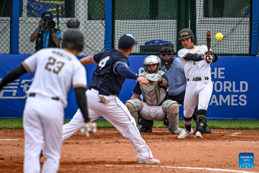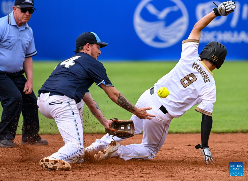 CHENGDU, 8 agosto, 2025 (Xinhua) -- Yasumi Kotaro (d), de Japón, compite durante el partido del grupo A de la ronda preliminar de sóftbol masculino entre Japón y Argentina en los Juegos Mundiales 2025, en Chengdu, en la provincia de Sichuan, en el suroeste de China, el 8 de agosto de 2025. (Xinhua/Feng Kaihua)