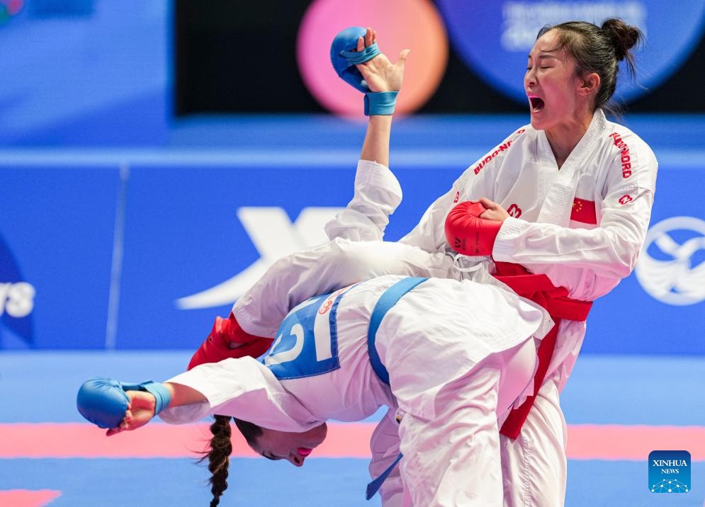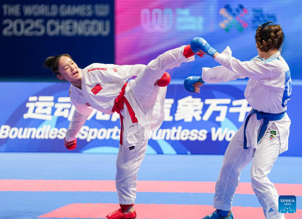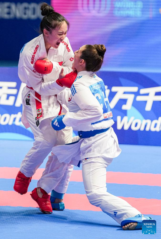 CHENGDU, 8 agosto, 2025 (Xinhua) -- Wei Yuchun (i), de China, compite ante Valentina Ivanina Toro Meneses, de Chile, durante el combate por la medalla de bronce de -55 kg de kumite femenino de karate en los Juegos Mundiales 2025, en Chengdu, en la provincia de Sichuan, en el suroeste de China, el 8 de agosto de 2025. (Xinhua/Tenzin Nyida)