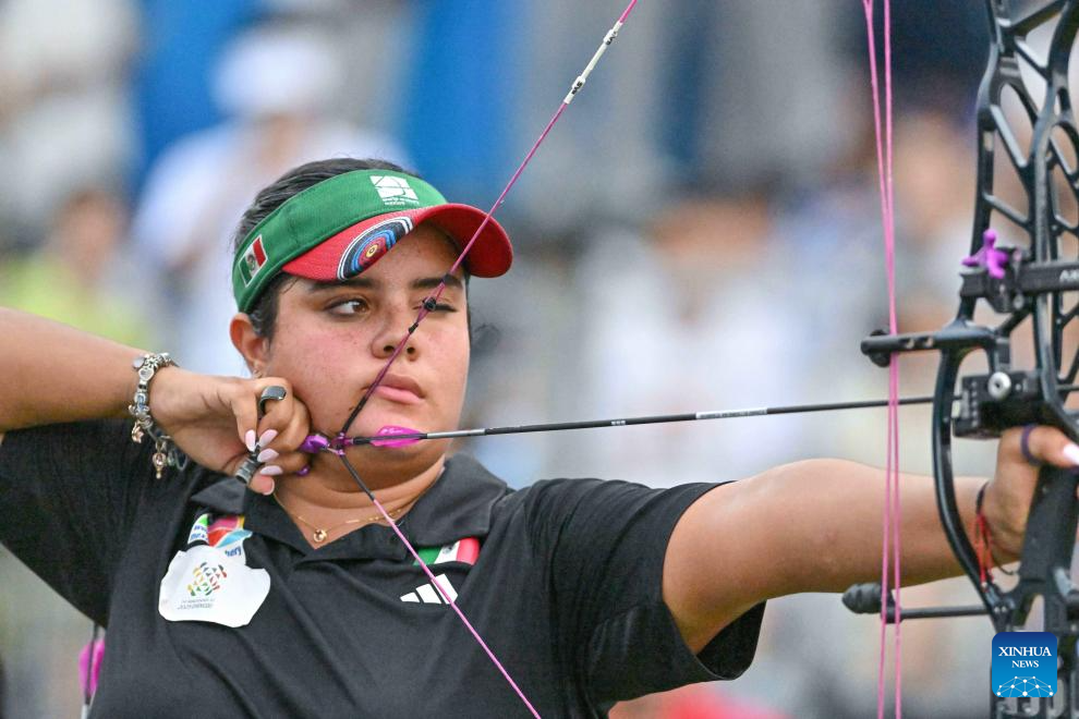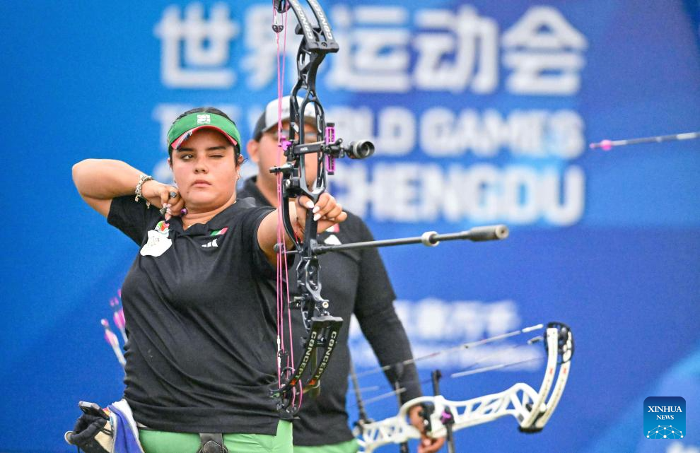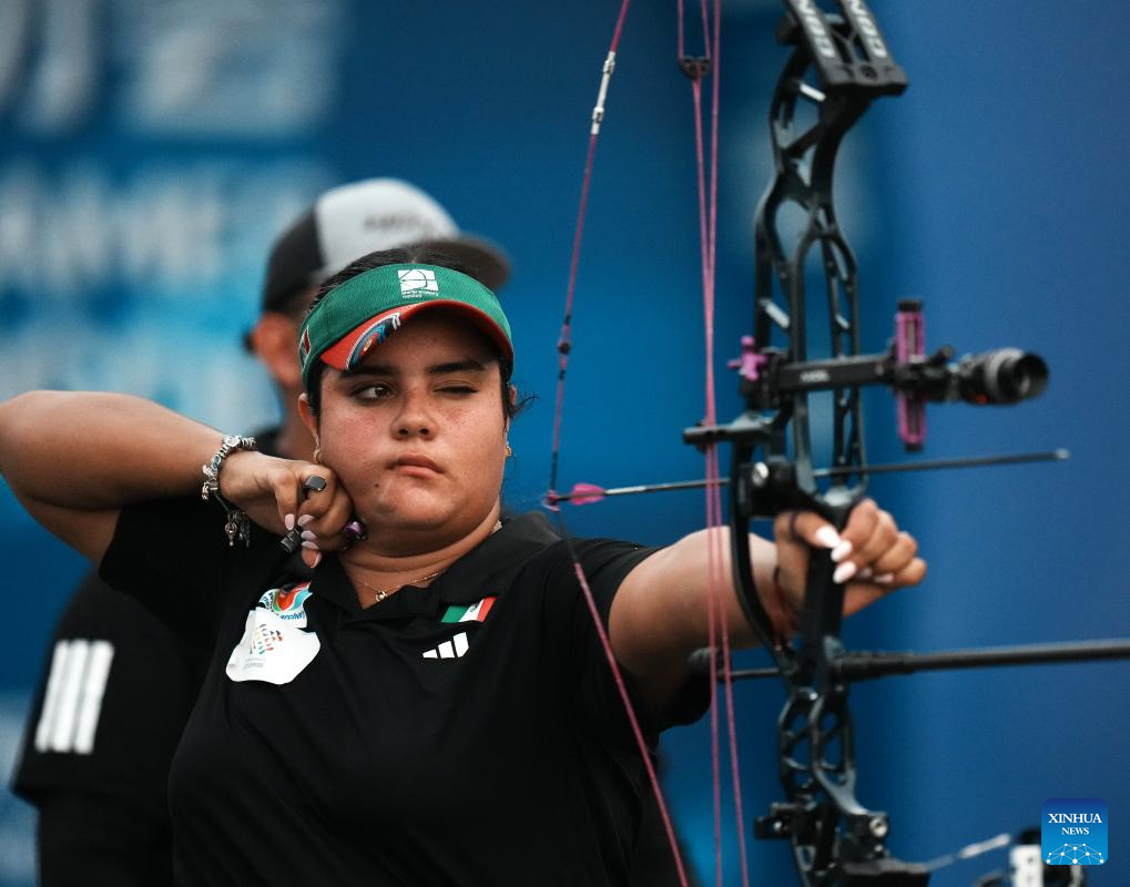 CHENGDU, 8 agosto, 2025 (Xinhua) -- Andrea Maya Becerra Arizaga, de México, compite durante el encuentro por la medalla de oro de compuesto por equipos mixtos del evento de tiro con arco entre Dinamarca y México en los Juegos Mundiales 2025, en Chengdu, en la provincia de Sichuan, en el suroeste de China, el 8 de agosto de 2025. (Xinhua/Yang Wenbin)