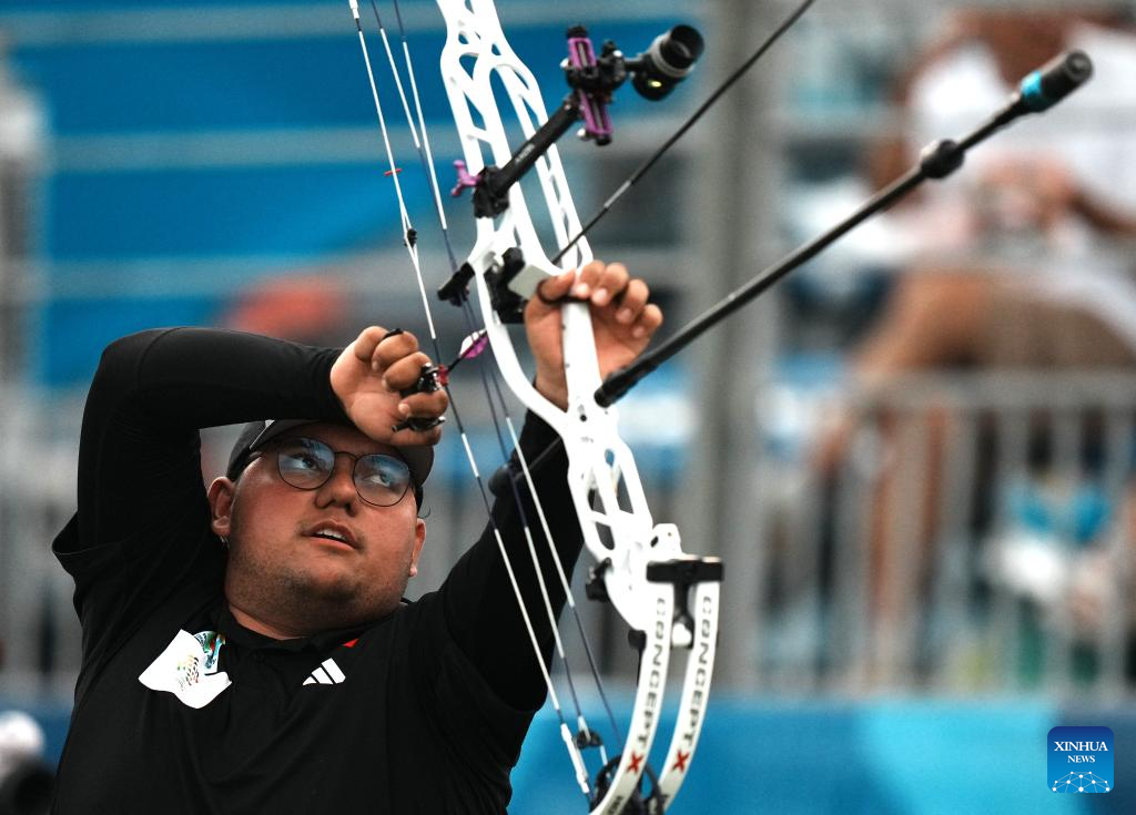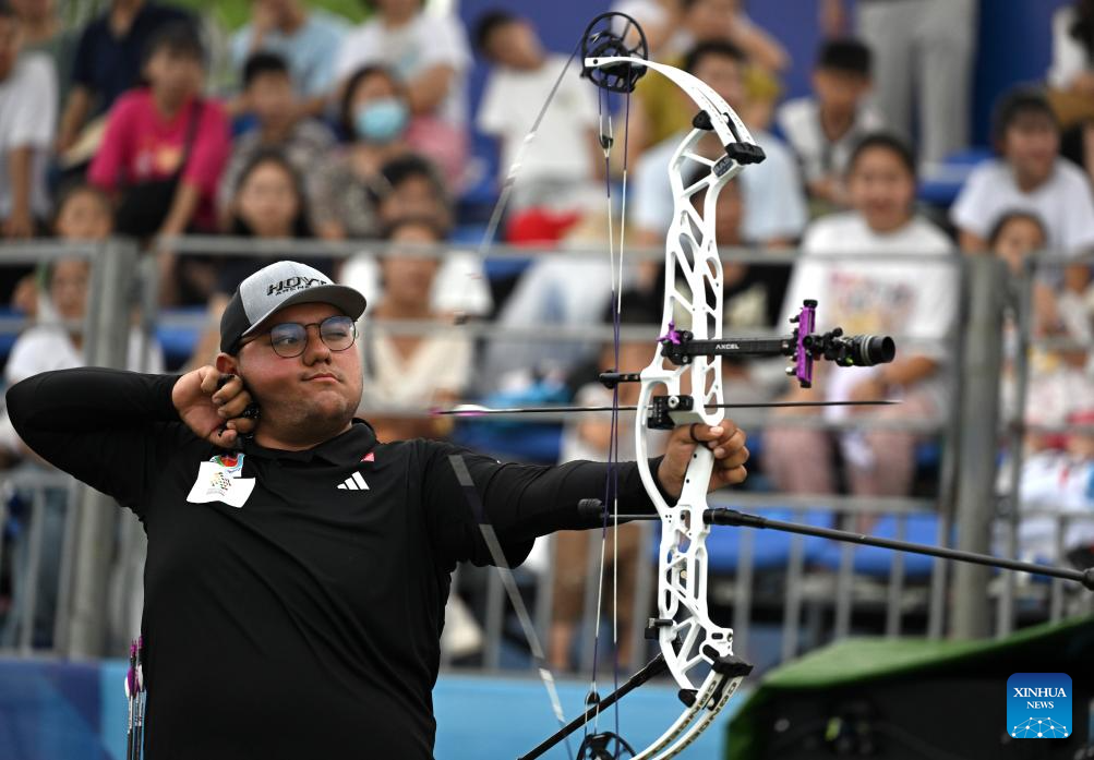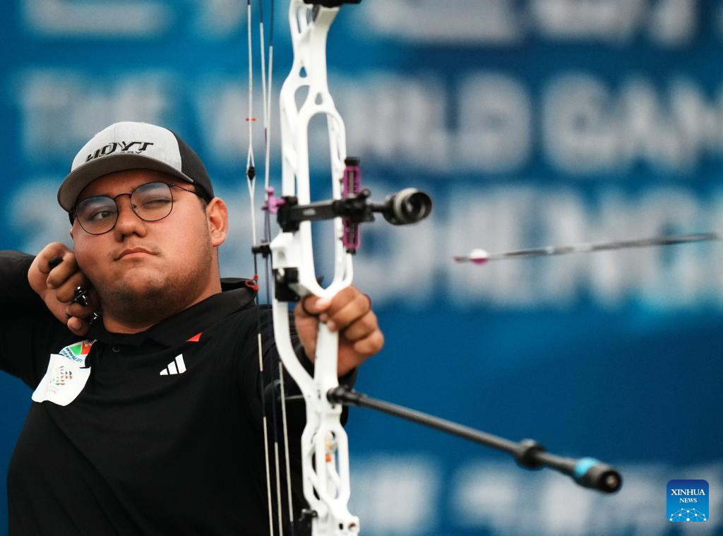 CHENGDU, 8 agosto, 2025 (Xinhua) -- Sebastián García Flores, de México, compite durante el encuentro de semifinal de compuesto por equipos mixtos del evento de tiro con arco entre Estados Unidos y México en los Juegos Mundiales 2025, en Chengdu, en la provincia de Sichuan, en el suroeste de China, el 8 de agosto de 2025. (Xinhua/Li Jianan)
