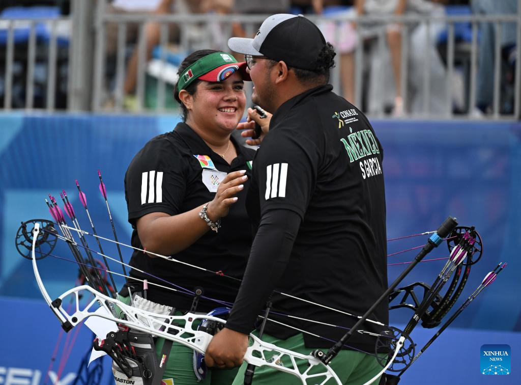 CHENGDU, 8 agosto, 2025 (Xinhua) -- Sebastián García Flores (d)/Andrea Maya Becerra Arizaga, de México, festejan al término del encuentro de semifinal de compuesto por equipos mixtos del evento de tiro con arco entre Estados Unidos y México en los Juegos Mundiales 2025, en Chengdu, en la provincia de Sichuan, en el suroeste de China, el 8 de agosto de 2025. (Xinhua/Li Jianan)