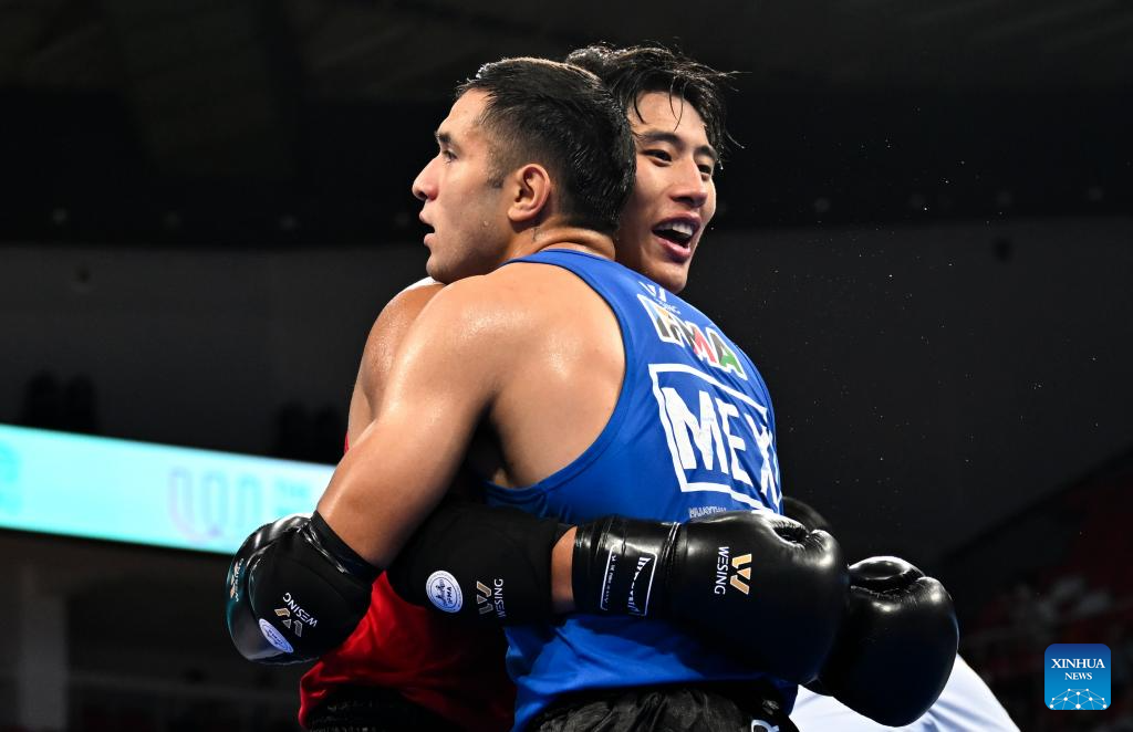 CHENGDU, 8 agosto, 2025 (Xinhua) -- Zhang Chengcheng (atrás), de China, abraza a Juan Antonio Hernández Totomol, de México, al término de los cuartos de final de -86 kg masculinos del evento de muay thai en los Juegos Mundiales 2025, en Chengdu, en la provincia de Sichuan, en el suroeste de China, el 8 de agosto de 2025. (Xinhua/Zhang Bowen)