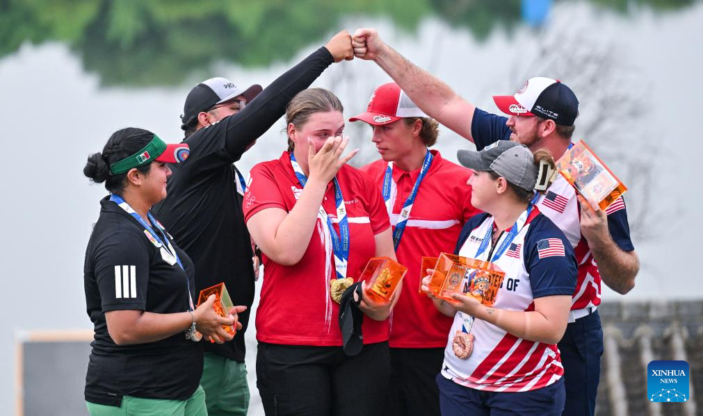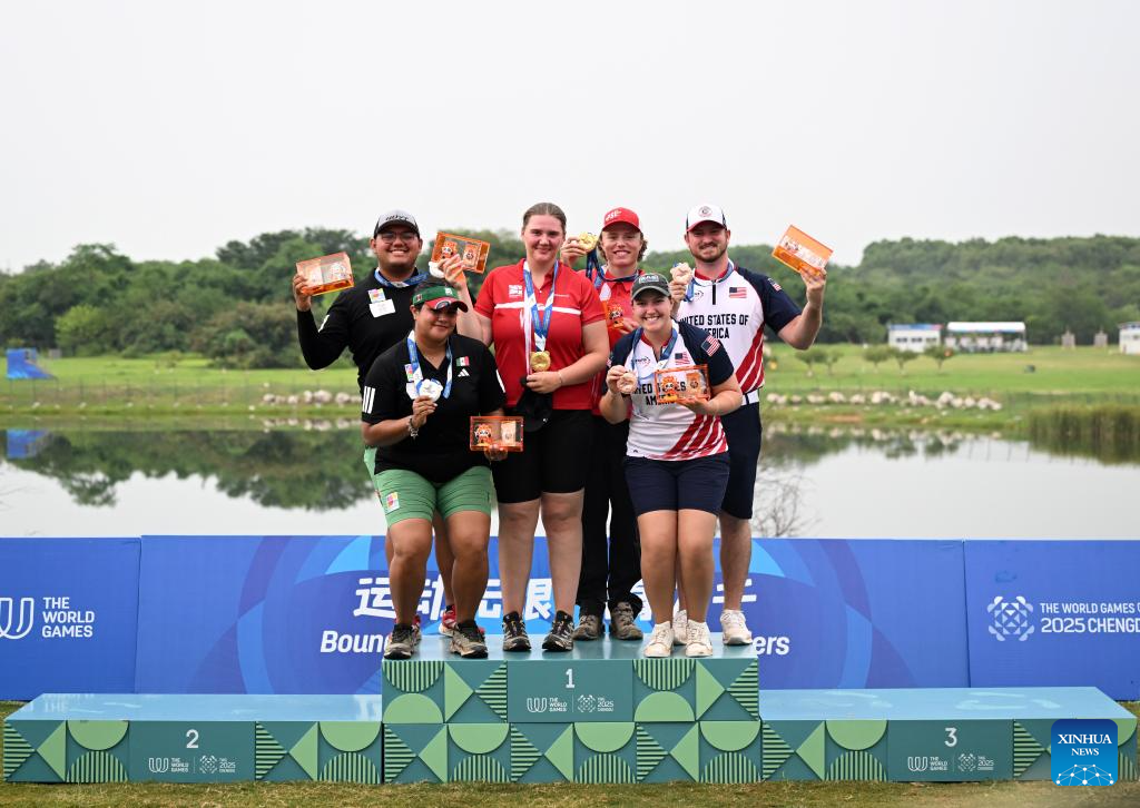 CHENGDU, 8 agosto, 2025 (Xinhua) -- Los medallistas de oro Mathias Bertrand Fullerton (3-d)/Sofie Louise Dam Marcussen (3-i), de Dinamarca, los medallistas de plata Sebastián García Flores (2-i)/Andrea Maya Becerra Arizaga (i), de México, y los medallistas de bronce Alexis Mercedes Ruiz (2-d)/Curtis Lee Broadnax, de Estados Unidos, posan durante la ceremonia de premiación del encuentro de compuesto por equipos mixtos del evento de tiro con arco en los Juegos Mundiales 2025, en Chengdu, en la provincia de Sichuan, en el suroeste de China, el 8 de agosto de 2025. (Xinhua/Yang Wenbin)