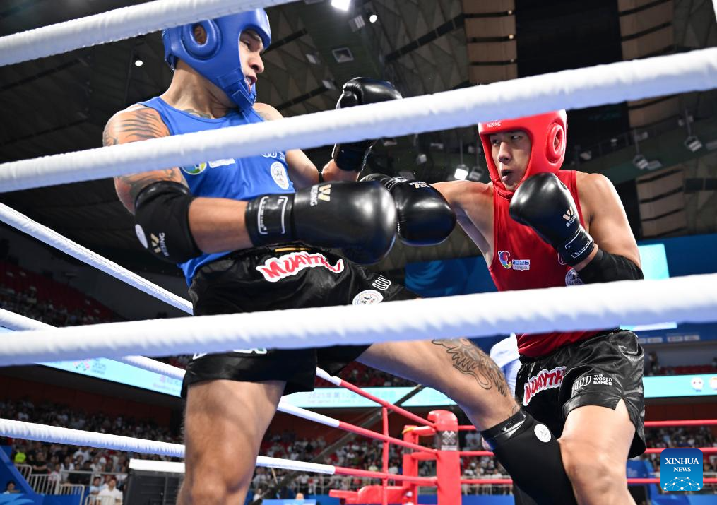 CHENGDU, 8 agosto, 2025 (Xinhua) -- Zhang Chengcheng (d), de China, compite ante Juan Antonio Hernández Totomol, de México, durante los cuartos de final de -86 kg masculinos del evento de muay thai en los Juegos Mundiales 2025, en Chengdu, en la provincia de Sichuan, en el suroeste de China, el 8 de agosto de 2025. (Xinhua/Zhang Bowen)